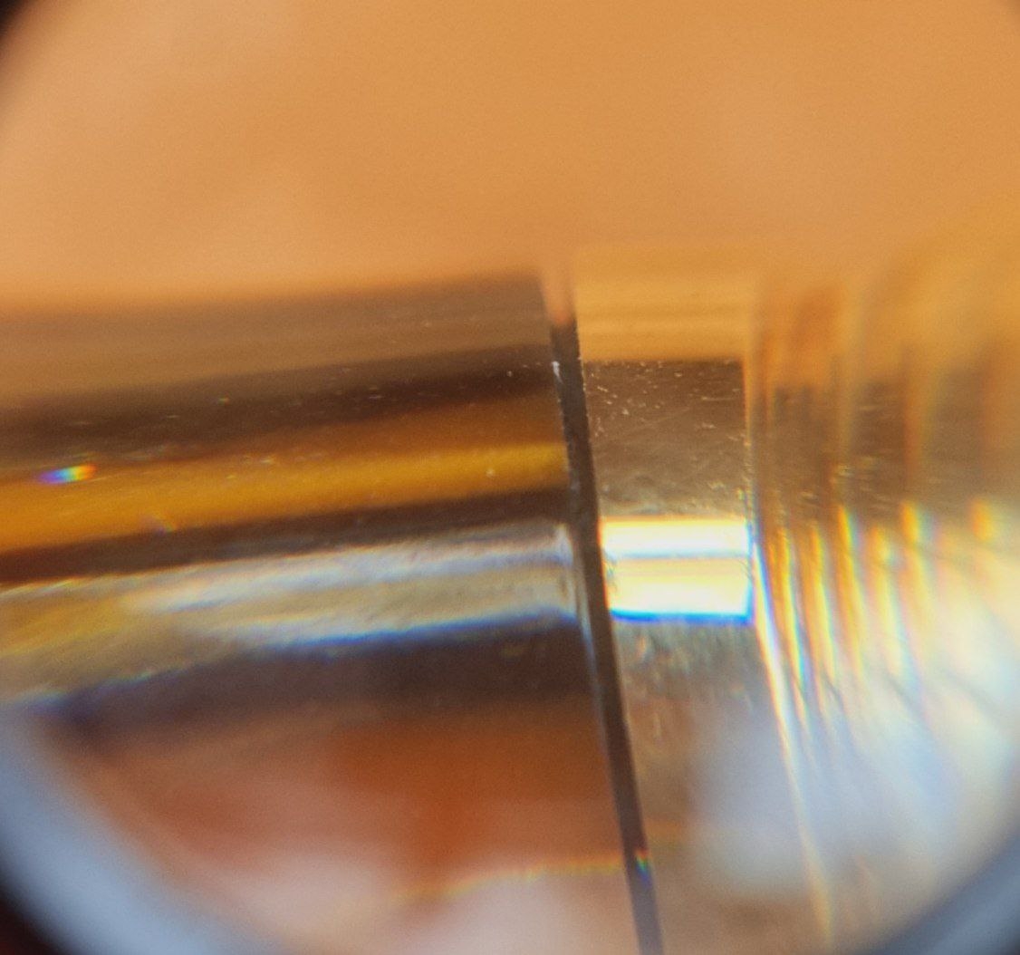 Я вынул перо, осмотрел стакан изнутри, опустил поршень в нижнее положение и проверил герметичность давлением: протечка точно между колбой и перьевым узлом. Снял его и секцию (приклеено было практически намертво, пришлось повозиться): все детали целые, просто разрушилось клеевое соединение.