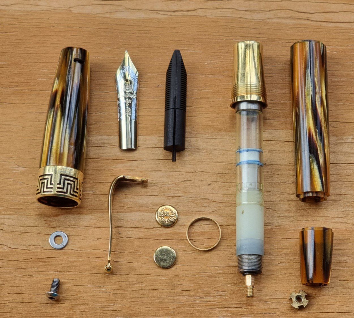 Изделие в так называемой черепаховой расцветке приехало в очень уставшем состоянии. Главные жалобы владельца были на тугой ход поршня, скрипящий барел, люфт ручки системы заправки; обнаружилось также слегка загнутое перо.