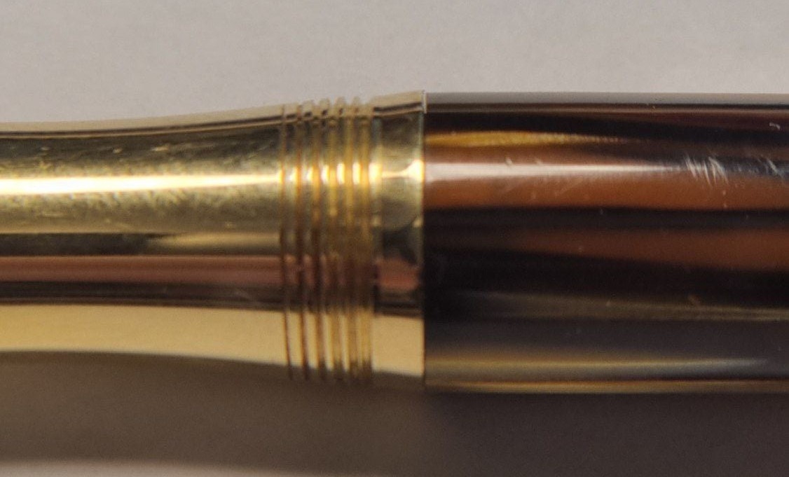 В отличие от стандартной версии, возможные «болезни» которой я рассматривал прежде, у этой вся металлическая фурнитура, включая грип-секцию, сделана из золота 750 пробы, материал корпуса — по-прежнему целлулоид.