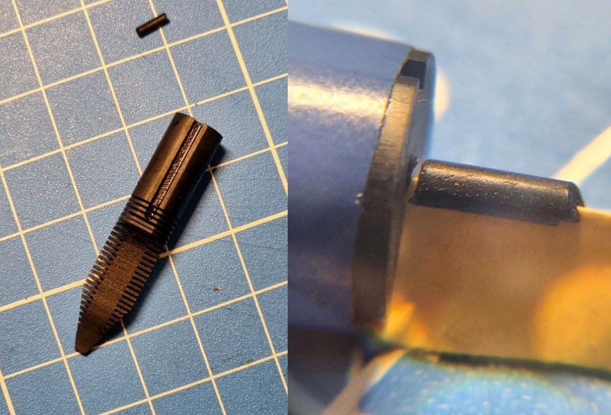 Из-за трещины я не стал испытывать судьбу, выкручивая втулку, а просто удалил её деструктивно (целлулоидная деталь не пострадала).