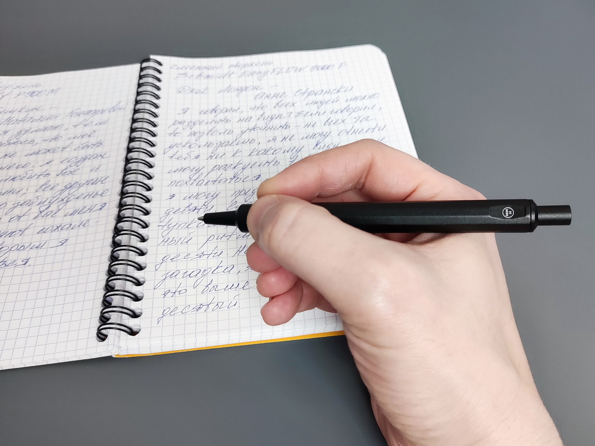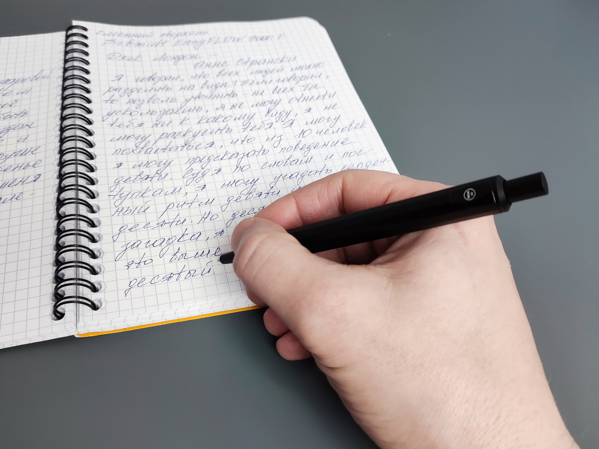 Здесь некоторых пользователей ждёт неприятный сюрприз — эта ручка точно не для всех, и перед покупкой желательно повертеть её в руках и непременно сделать записи. Ранее я писал, что люблю крупные ручки, лично у меня здесь полный мэтч. Однако большинству пользователей, привыкших к довольно тонким шариковым ручкам, эта может показаться неповоротливым бревном. И поначалу письмо такой ручкой точно будет непривычным. Казалось бы, каких-то пара миллиметров в диаметре, а какая разница в ощущениях, если вы понимаете, о чём я.