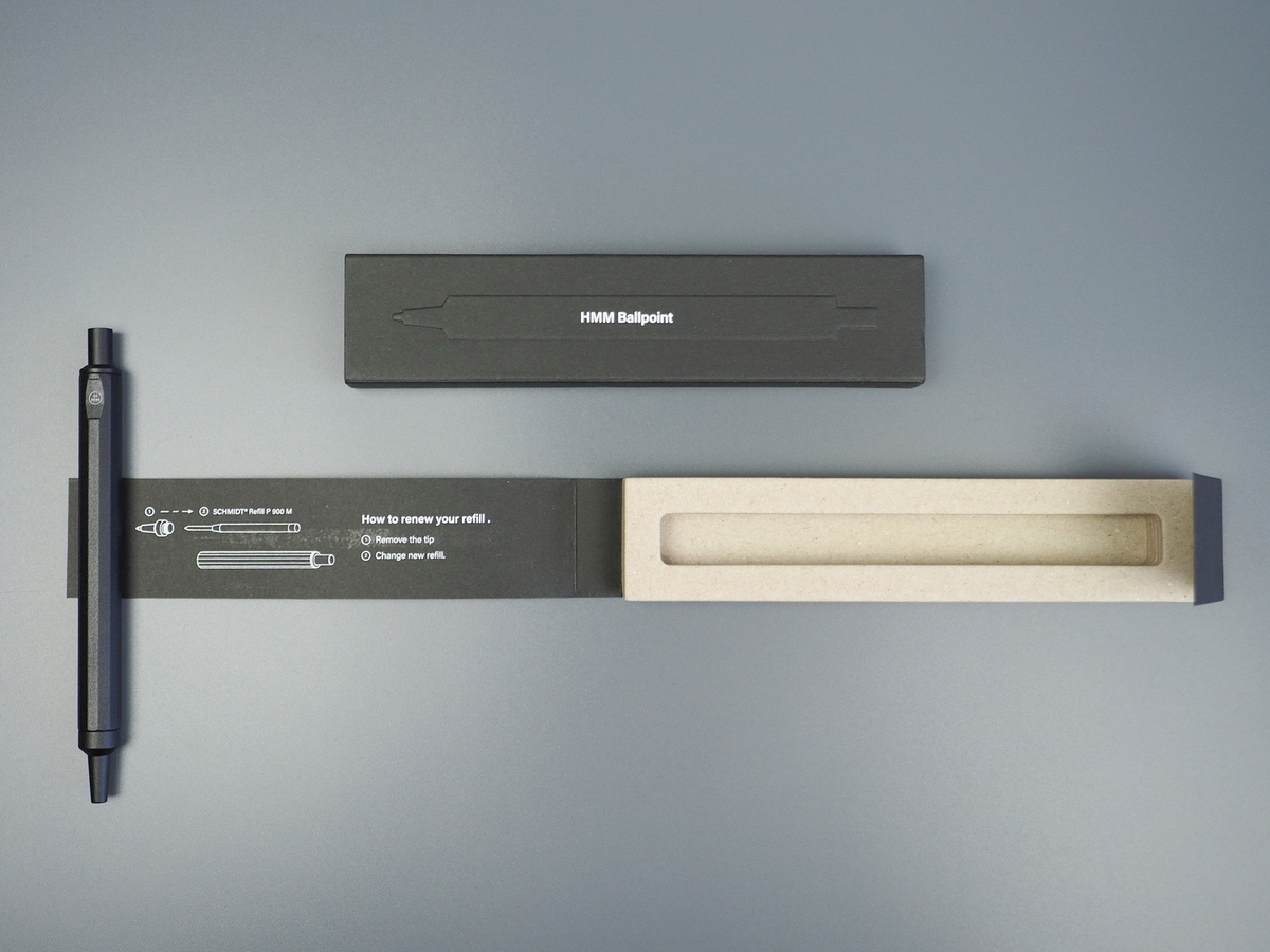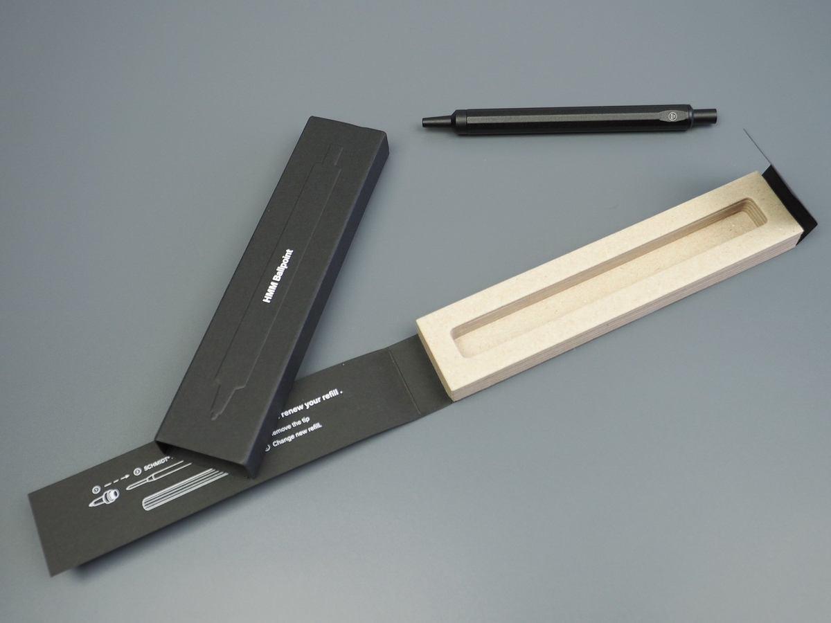 Не мои слова, но Капитана Очевидности, что в тренде, особенно в западных странах, даже не в западных, а с западными взглядами, бережливое отношение к природе. Мне Тайвань видится именно такой страной — в смысле с западными взглядами. А потому упаковка весьма аскетичная, с минимумом визуального шума. Ложемент сделан из нескольких слоёв серого неокрашенного картона: его видно на срезе и вырубке для укладки ручки. И всё это тоже скрывается в картонной обечайке, но чёрной и матовой. На обечайке упаковки тиснение в форме ручки, а поверх надпись белой краской HMM Ballpoint. Думаю, перевод неуместен. Под обечайкой, в качестве прокладки — чёрная же бумага, а на ней белым цветом отпечатана инструкция по замене стержня. Смотрится круто!