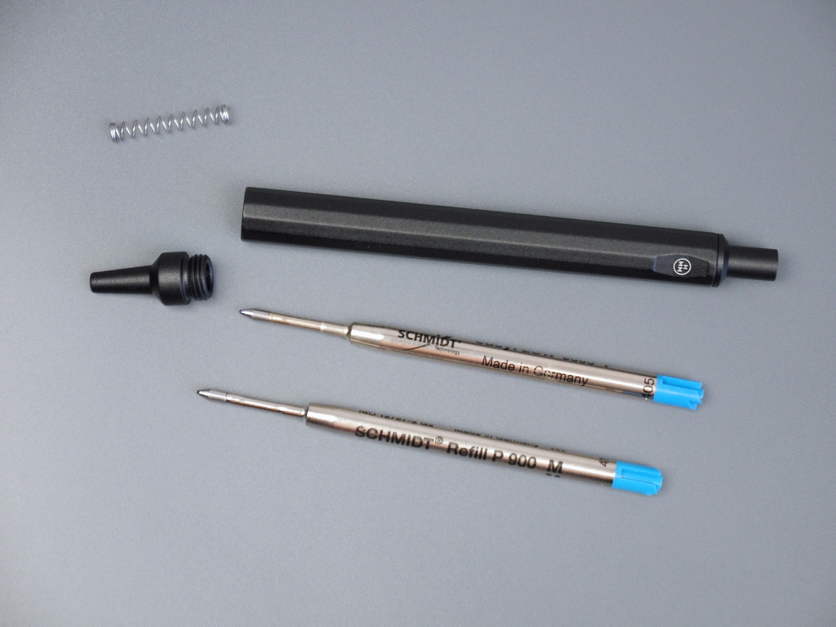 Начать я решил с поиска ручки под стержень. Поясню. При выборе перьевой ручки мы опираемся сразу на все её показатели: внешний вид, размер, перо, его размер, подачу, да много всего. Но в шариковой ручке всё просто: её душа, её мотор — стержень. Зная формат, можно подбирать из большого количества вариантов залитых чернил. Для своей ручки я заранее выбрал формат, заказал стержень, протестировал его и остался весьма доволен. Выбор пал на формат G2, его ещё называют паркеровским, потому что таких стержней и ручек для таких стержней делают видимо-невидимо. Ну, а плюсом я уже нашёл отлично пишущий стержень для замены того, что будет в инструменте. Это Schmidt EasyFLOW 9000, цвет синий. Размерность штриха я выбрал F (тонкий) и не прогадал: линия тонкая. Да, это не перьевая ручка, но стержень пишет легко, мягко, непрерывно, шарик отлично вращается и не издаёт посторонних звуков. В общем, я доволен.