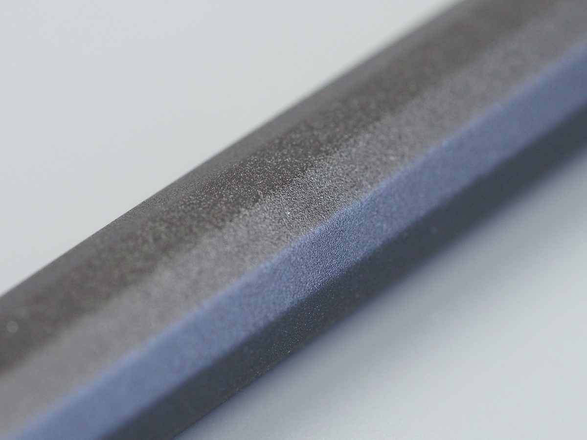 Ручка чёрная матовая, кажется, будто грубой обработки, как любят писать англоязычные производители — RAW (сырой). Конечно же, это нарочито. Мне стилёк инструмента очень зашёл. Корпус ручки прямой без сужений и расширений, о двенадцати граней или гранях — фиг знает, как будет правильно на этом вашем великом и могучем.