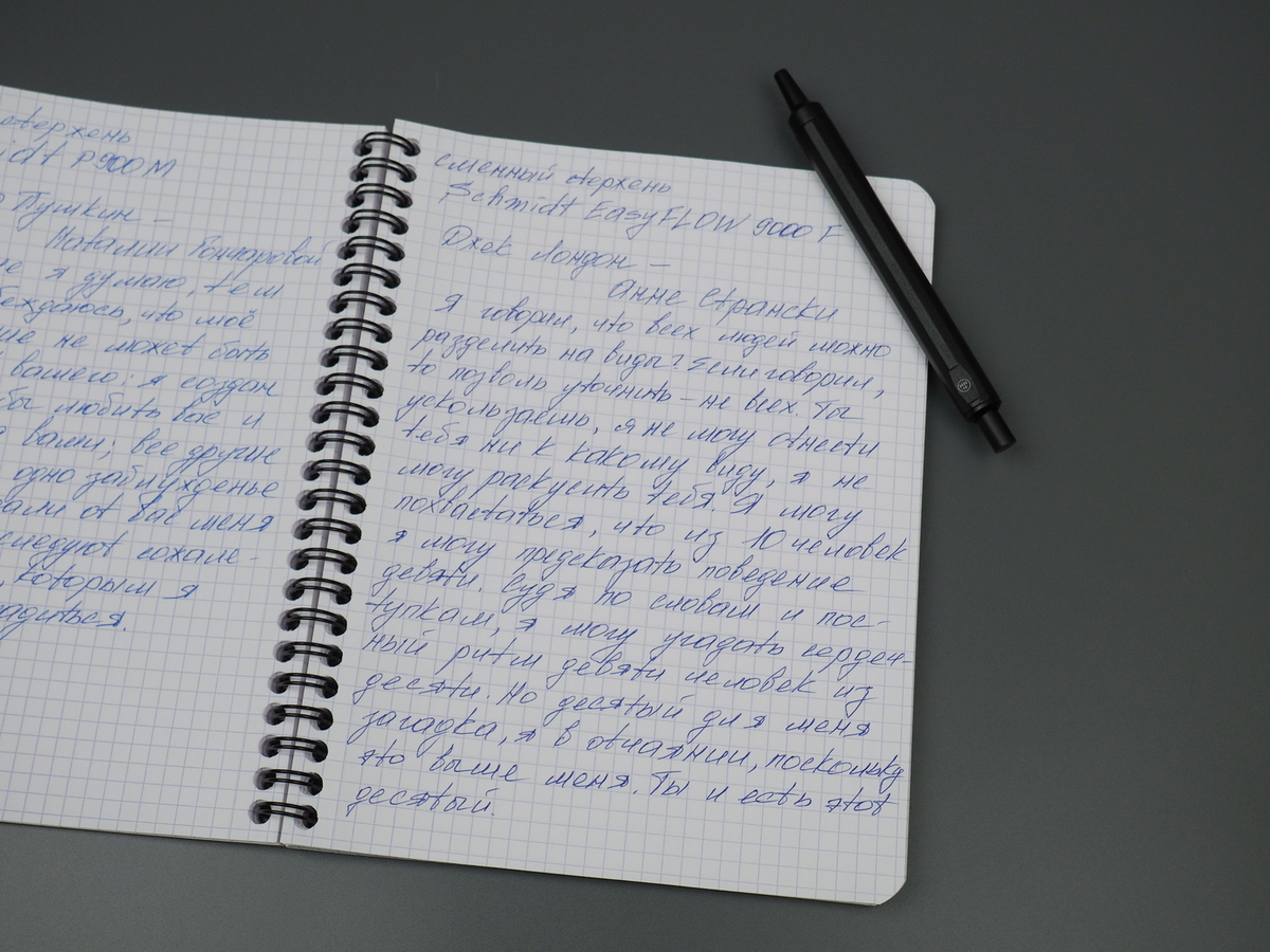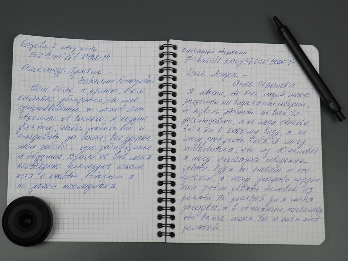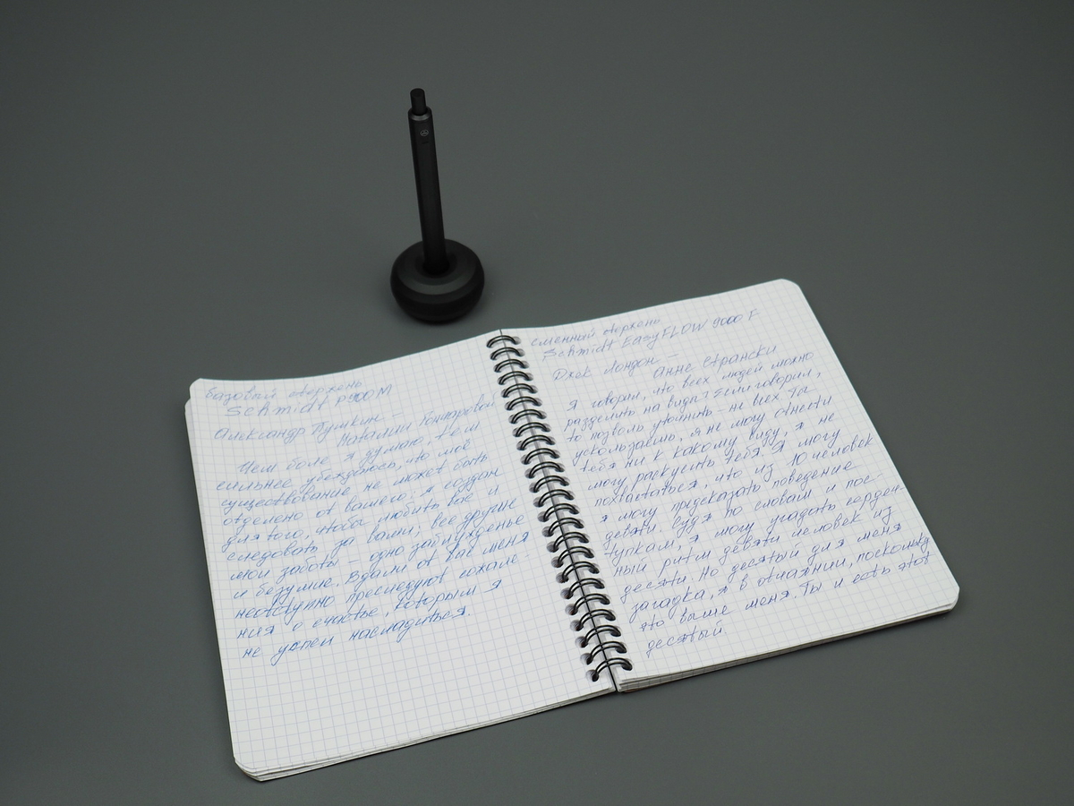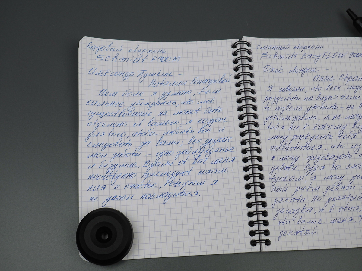 В шариковой ручке сердце — установленный стержень, и по большей части от него зависит, как она будет писать. И если стержень пишет плохо, а замены ему не найти, то всё, ручке конец. По этой причине я и старался выбрать ручку со стержнем популярного формата. Мне повезло: в этой ручке используется, пожалуй, один из самых распространённых стандартов так называемых объёмных стержней — G2, его ещё называют «паркеровским». Благодаря такой популярности очень много производителей разных стран делают такие стержни: найти необходимый цвет и ширину штриха не доставит сложностей. Я уже заранее выбрал для себя стержень, тестировал его во многих ручках. Мой выбор — Schmidt EasyFLOW 9000. Да, это всё ещё шариковый стержень и его не стоит сравнивать с лёгкостью письма перьевыми ручками, но для шариковых он очень хорош. Кстати, в базе тоже был «шмидтовский» стержень, но классом ниже, и писал он соответствующе: нормально, без неожиданностей и прорывов. Поэтому я без сожалений его тотчас и заменил.