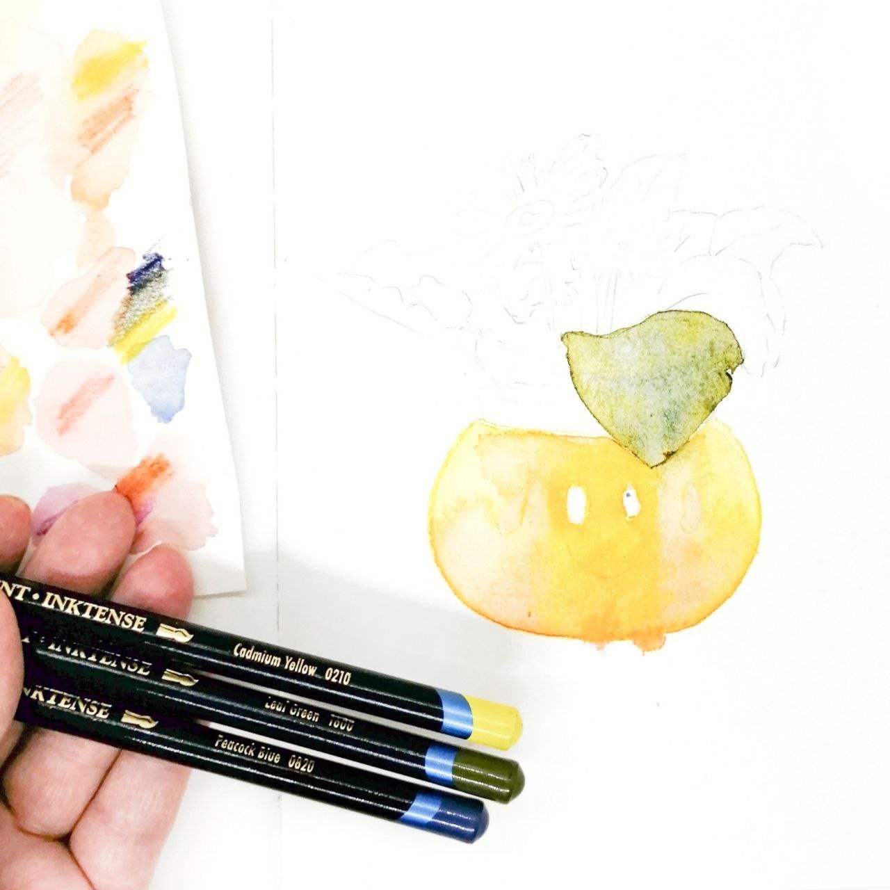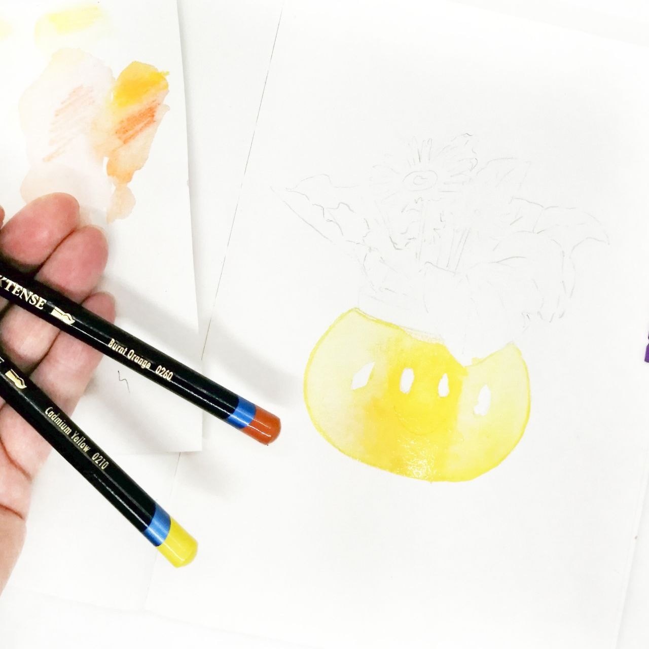 Заштриховываем горшочек по сухому жёлтым карандашом № 0210 от середины к бокам, чтобы создать объём, оставляя блики и нетронутыми места для глазок. Вводим охру № 0260 в центр горшочка и размываем все оттенки кисточкой, оставляя по бокам жёлтый цвет.