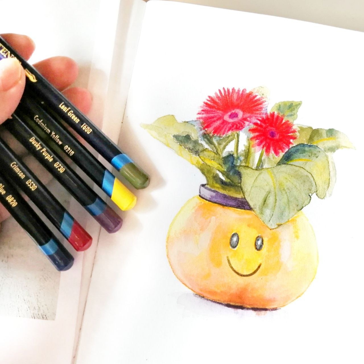 2. Затем вводим следующие оттенки карандашей уже по мокрому. Беря с грифеля, можно намешивать на палитре с предыдущими цветами, делая горшочек более живописным и объёмным: фиолетовый № 0720, розовый № 0320.