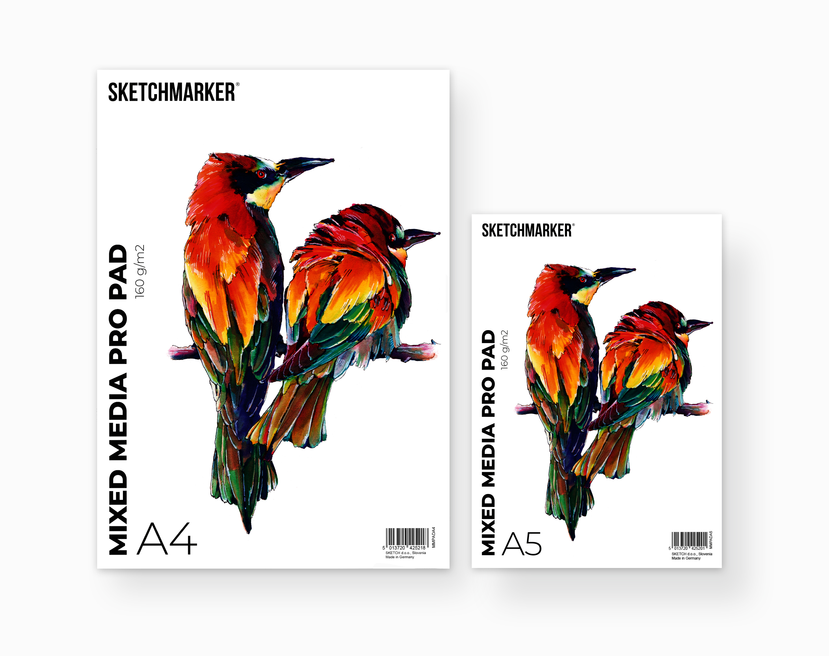 SKETCHMARKER Mixed Media Pro Pad — альбомы-склейки форматов А5 и А4, с 30 листами плотностью 160 г/м². Универсальная бумага с шероховатой поверхностью, подходит для экспериментов разными материалами, в том числе для мокрых техник.