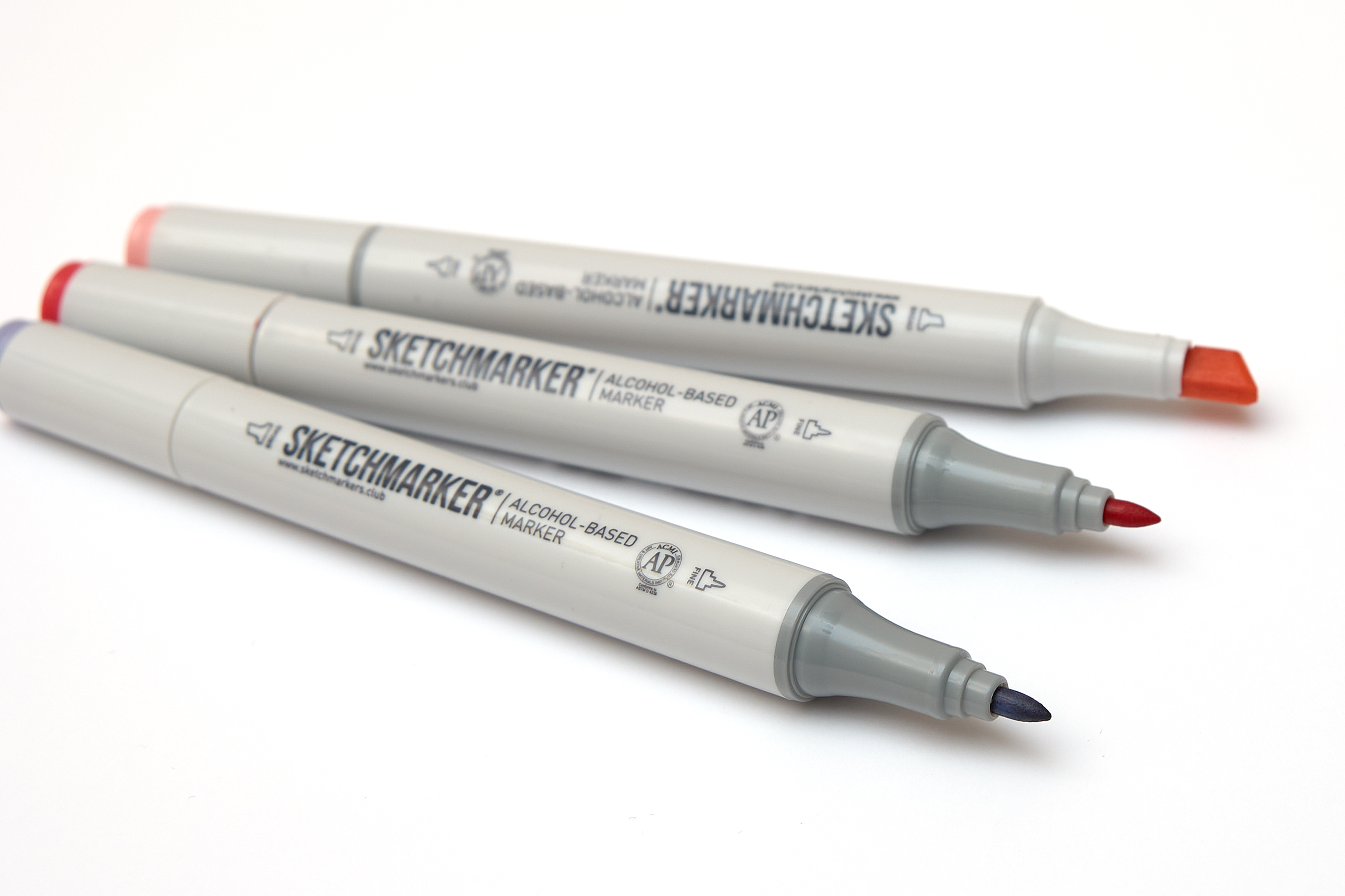Спиртовые маркеры SKETCHMARKER имеют два наконечника: «пуля» (для точечной работы) и «долото» (для покрытия цветом больших поверхностей). Цветовая палитра серии — 200 цветов.