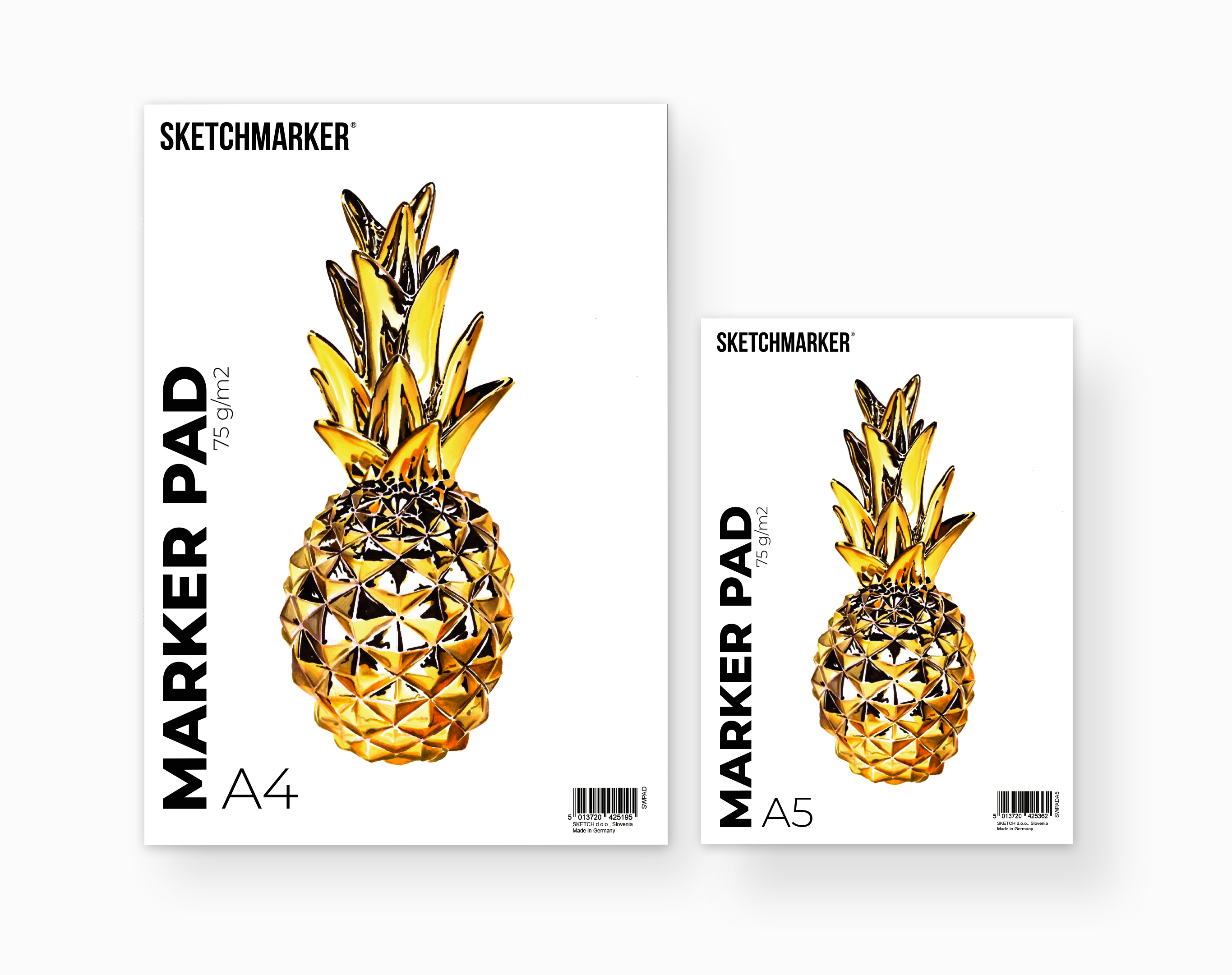 SKETCHMARKER Marker Pad — альбомы-склейки форматов А5 и А4, с 50 листами плотностью 75 г/м². Бумага, разработанная специально для спиртовых маркеров, с обработкой оборотной стороны листа, которая не допускает растекание пигмента по листу и насквозь. Отлично передаёт цвета маркеров, расходует мало чернил.