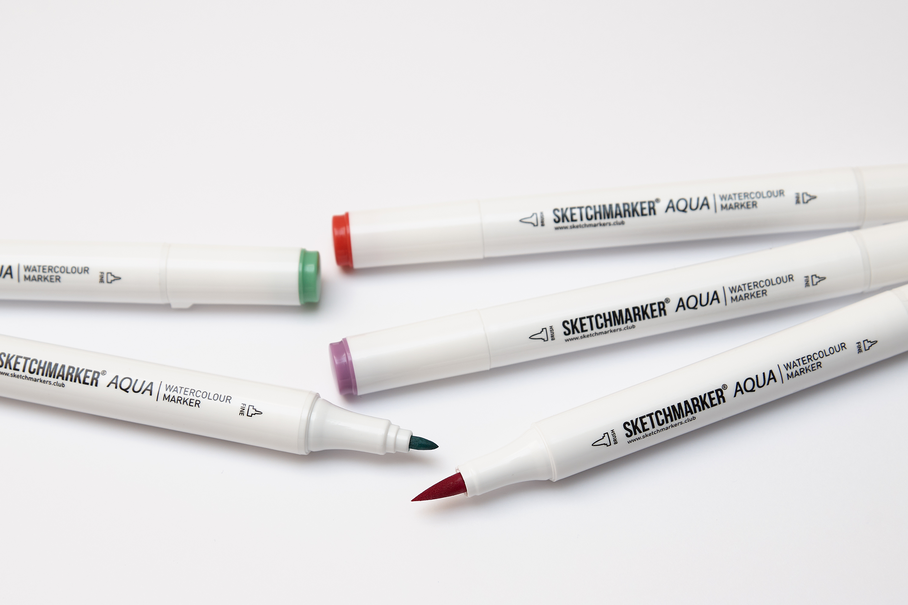 Акварельные маркеры SKETCHMARKER Aqua — творческий инструмент, сочетающий в себе преимущества акварельных и маркерных техник. У маркера два наконечника: тонкий наконечник «пуля» и перо-кисть. Палитра состоит из 72 оттенков.