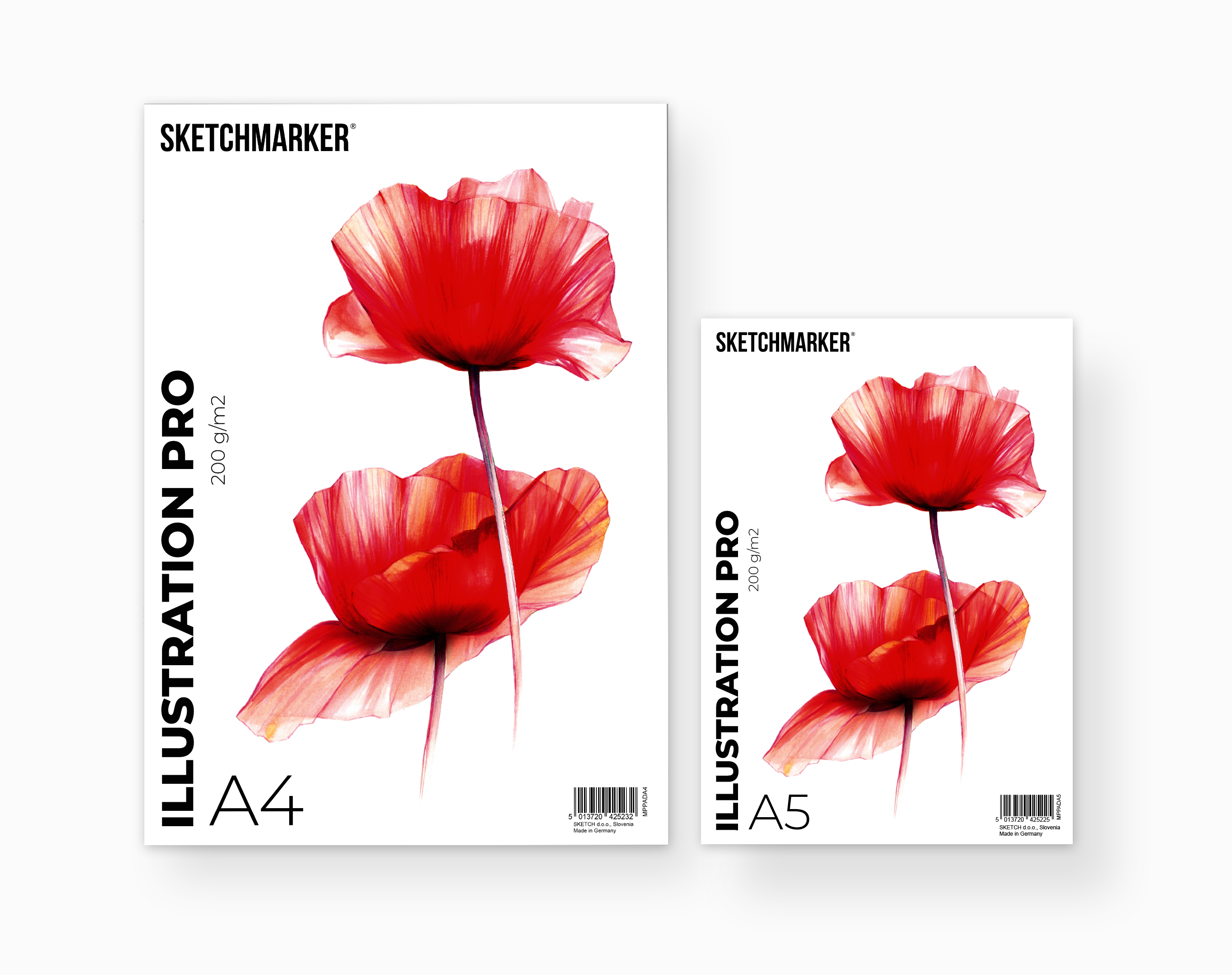 SKETCHMARKER Illustration Pro — альбомы-склейки форматов А5 и А4, с 30 листами плотностью 200 г/м². Гладкая бумага естественно-белого цвета разработана для спиртовых маркеров, ручек, карандашей, брашпенов, туши. Выдерживает многослойное нанесение материалов.