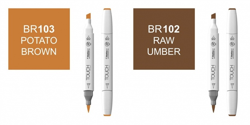 Тёпло-коричневые Touch Brush: BR134 — шёлк натуральный; BR114 — бежевый бледный; BR103 — коричневый картофельный; BR102 — умбра натуральная: