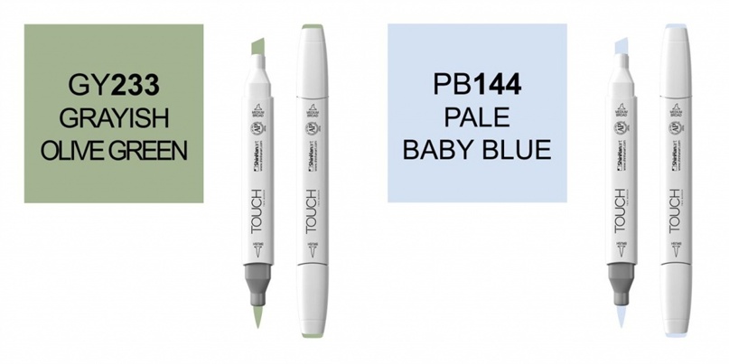 Дополнительные цвета Touch Brush: GY233 — зелёно-серый оливковый; PB144 — синий нежный бледный: