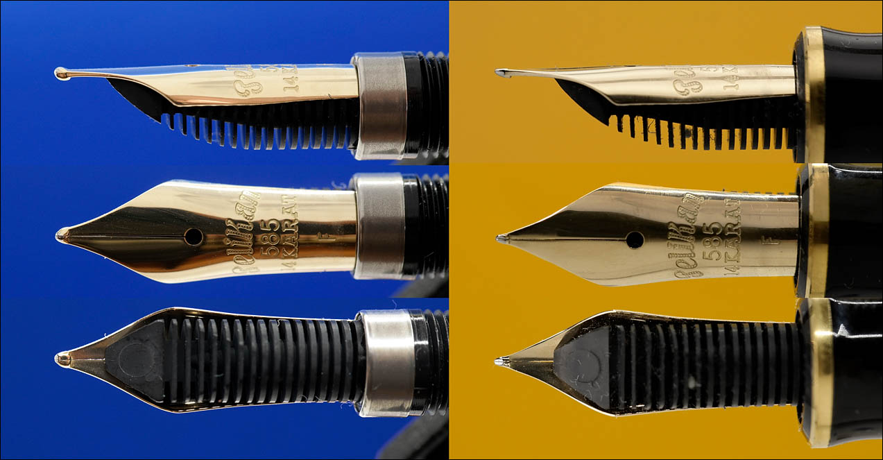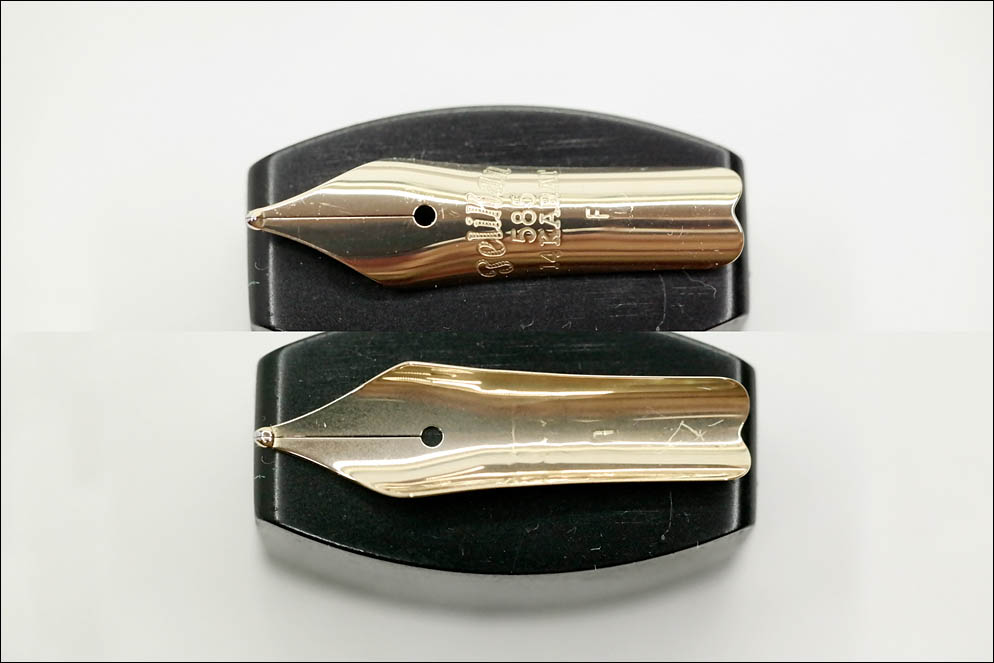 Золотое, 14-каратное, ординарно жёсткое современное перо и традиционно большего размера, чем указанная размерность по европейскому стандарту. На перо нанесены имя бренда Pelikan курсивом в историческом написании, проба золота — 585, каратность — 14 KARAT и размерность кончика — F.