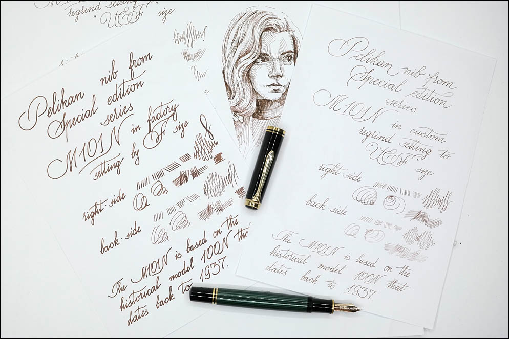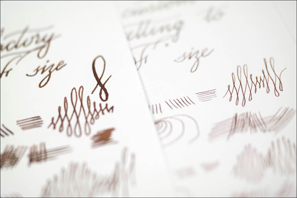 Оригинальное перо с заводскими настройками: ширина линии прямой стороной — 0,6 (!) мм, небольшой нажим может увеличить эту линию за счёт большей подачи до 1,0 мм. Обратная сторона давала линию 0,4 мм.