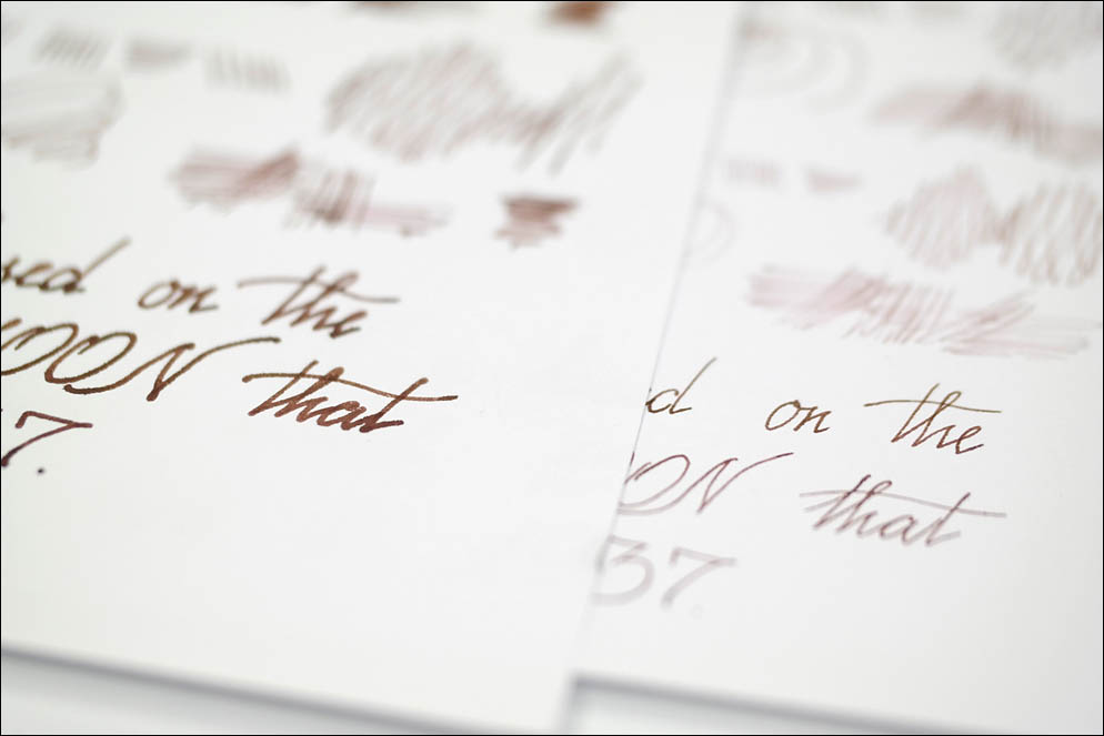 В качестве дополнения привожу более крупные фотографии тестового письма для сравнения линий. На общих фотографиях линия выглядит более прозрачной, как со скупой подачей, но это не так — просто она значительно тоньше.