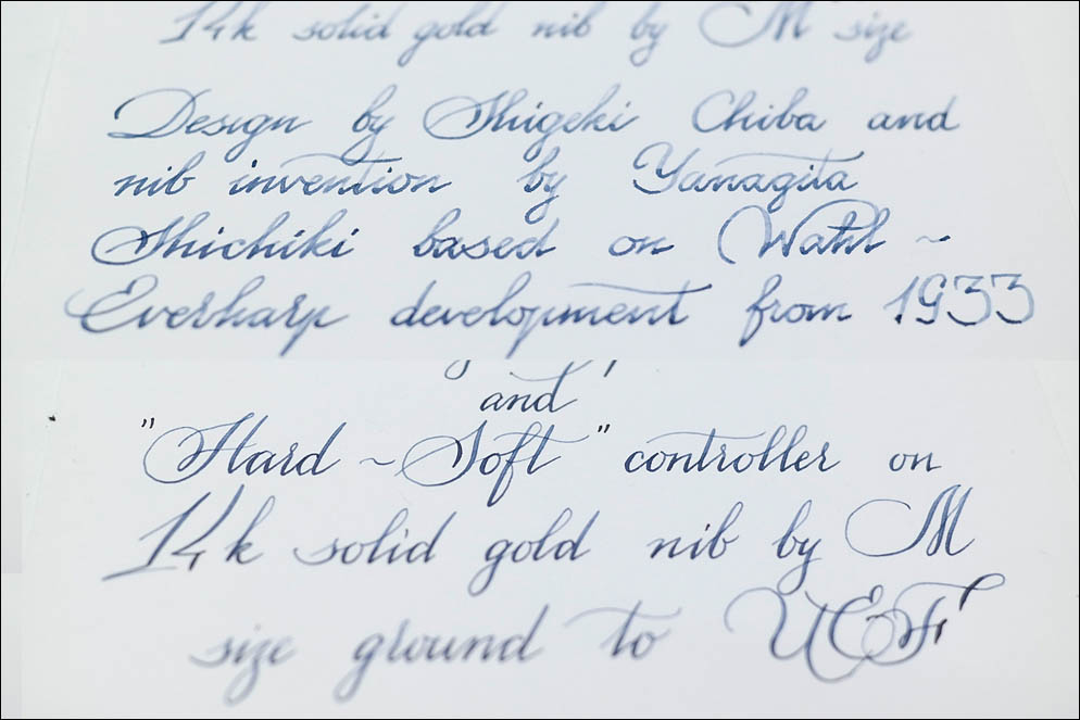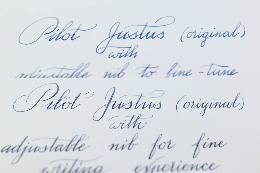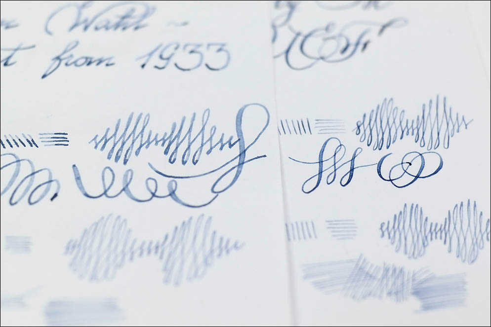 Ниже фотографии текстовых примеров в одном масштабе для сравнения тонких линий и линий в нажиме. На новом пере линии имеют бóльшую насыщенность, хотя чернила и бумага одинаковые.