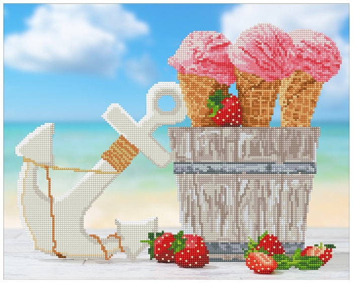 Пожалуй, самой актуальной позицией распродажи можно назвать кристальную мозаику «Летняя прохлада» от ТМ «Фрея». На этой картине представлены главные атрибуты летнего отдыха: якорь на фоне моря, мороженое, клубника… Отлично подойдёт как для украшения интерьера, так и в качестве подарка в готовом виде или в наборе. И всё это со скидкой 31 %.