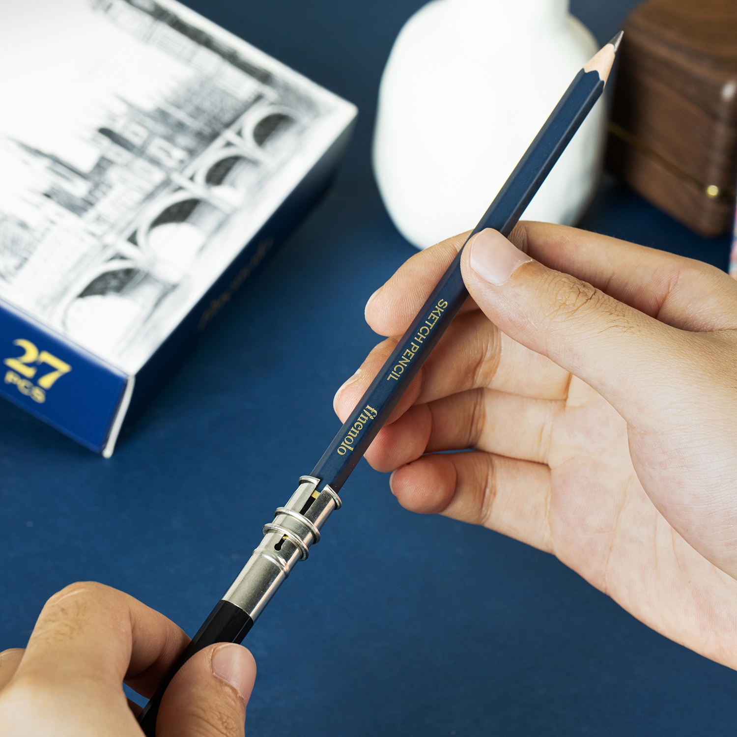 Набор для скетчинга из 27 предметов от Finenolo содержит всё необходимое для зарисовок и набросков. В составе: 3 угольных карандаша, 16 чернографитных карандашей, удлинитель для карандашей, 3 растушёвки, нож для заточки, ластик-клячка, каучуковый ластик, тканевый пенал-свиток.