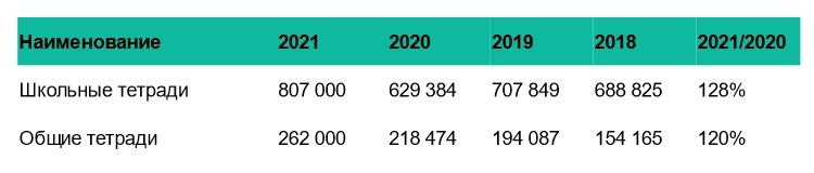 9 месяцев этого года стали рекордными с точки зрения производства школьных и общих тетрадей за последние несколько лет: рост 28 и 20 % соответственно к 9 месяцам 2020 года, но если даже сравнивать с 2019-м, рост также значительный.
