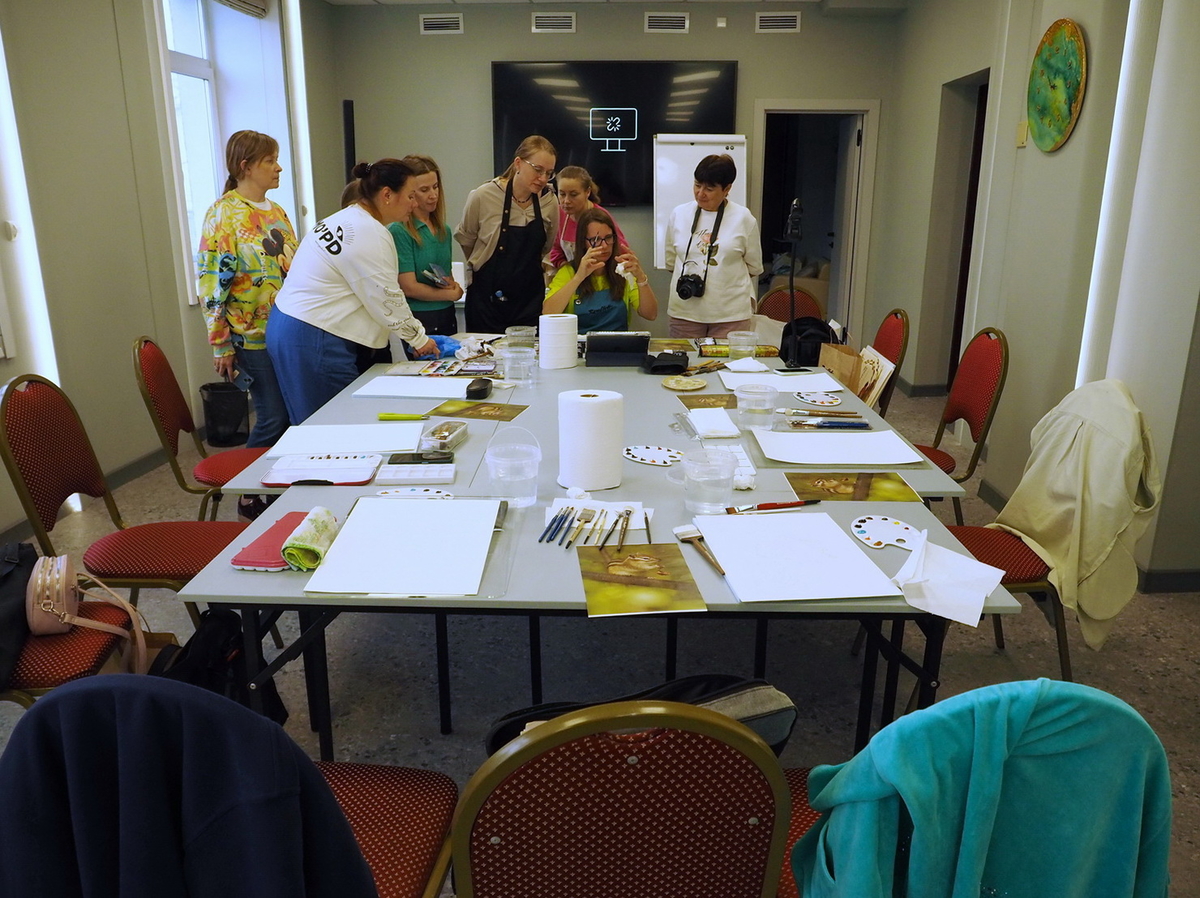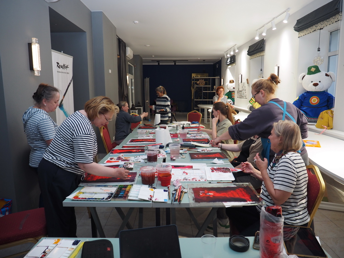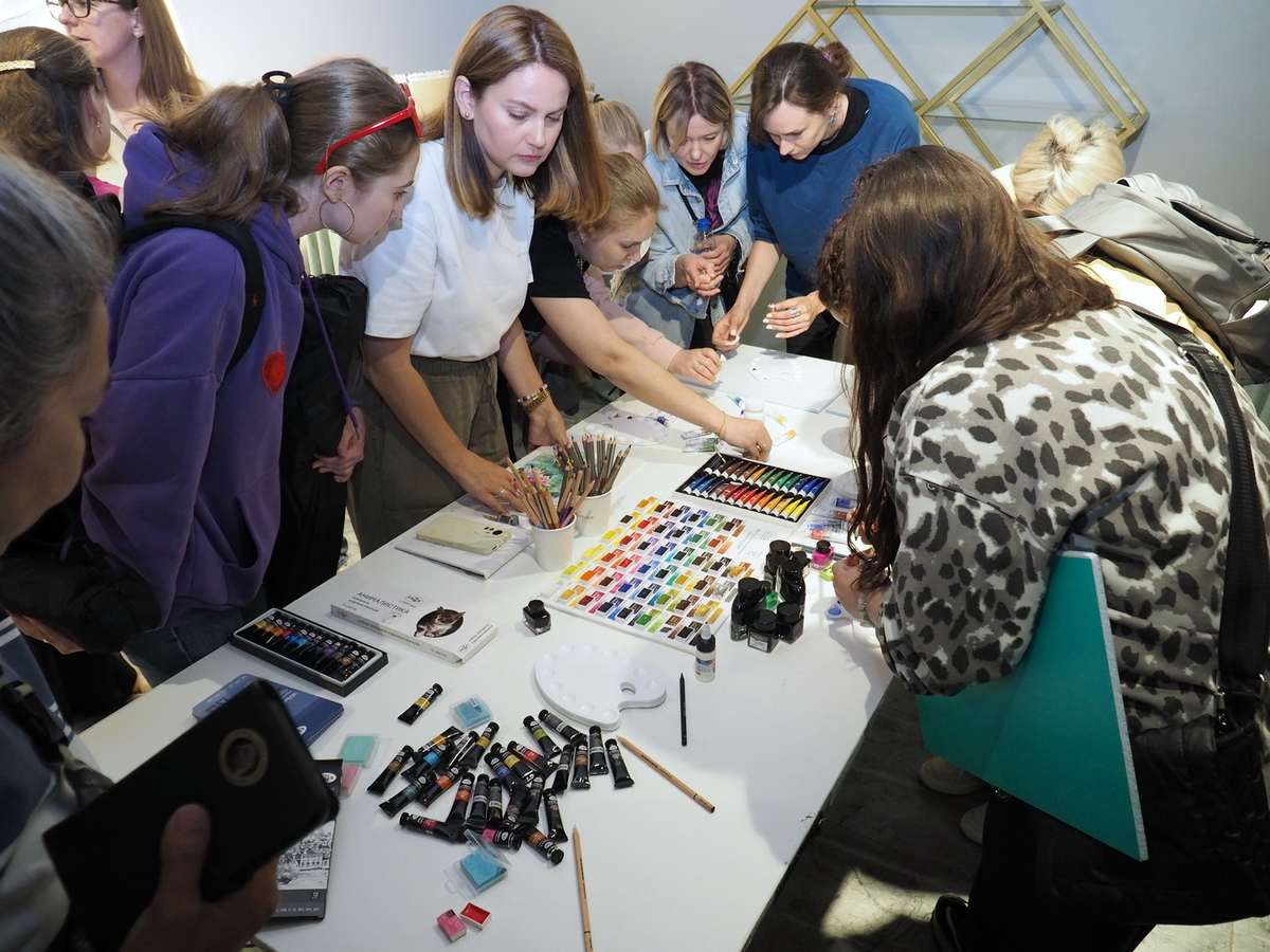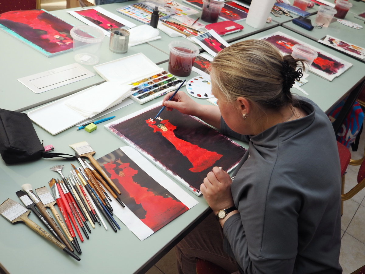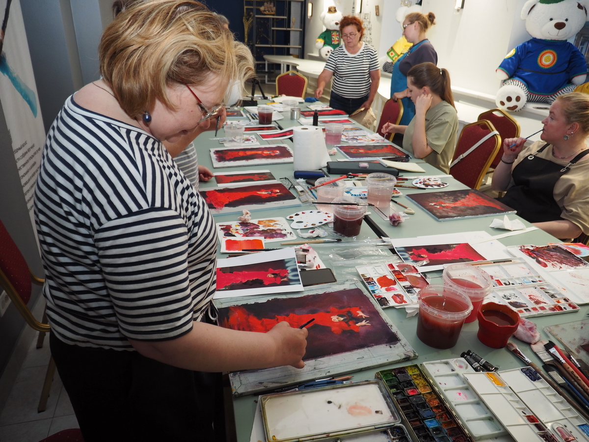 А в это время на мастер-классах царила весёлая и непринуждённая атмосфера. Участники вдохновлённо работали над своими картинам. Одна из них призналась: «Я ещё никогда в жизни не использовала столько красок!» — в контексте, что всегда рисовала и продумывала, как сэкономить, а тут же «всё включено»: бери и пользуйся материалами, сколько нужно, для сотворения своего шедевра.