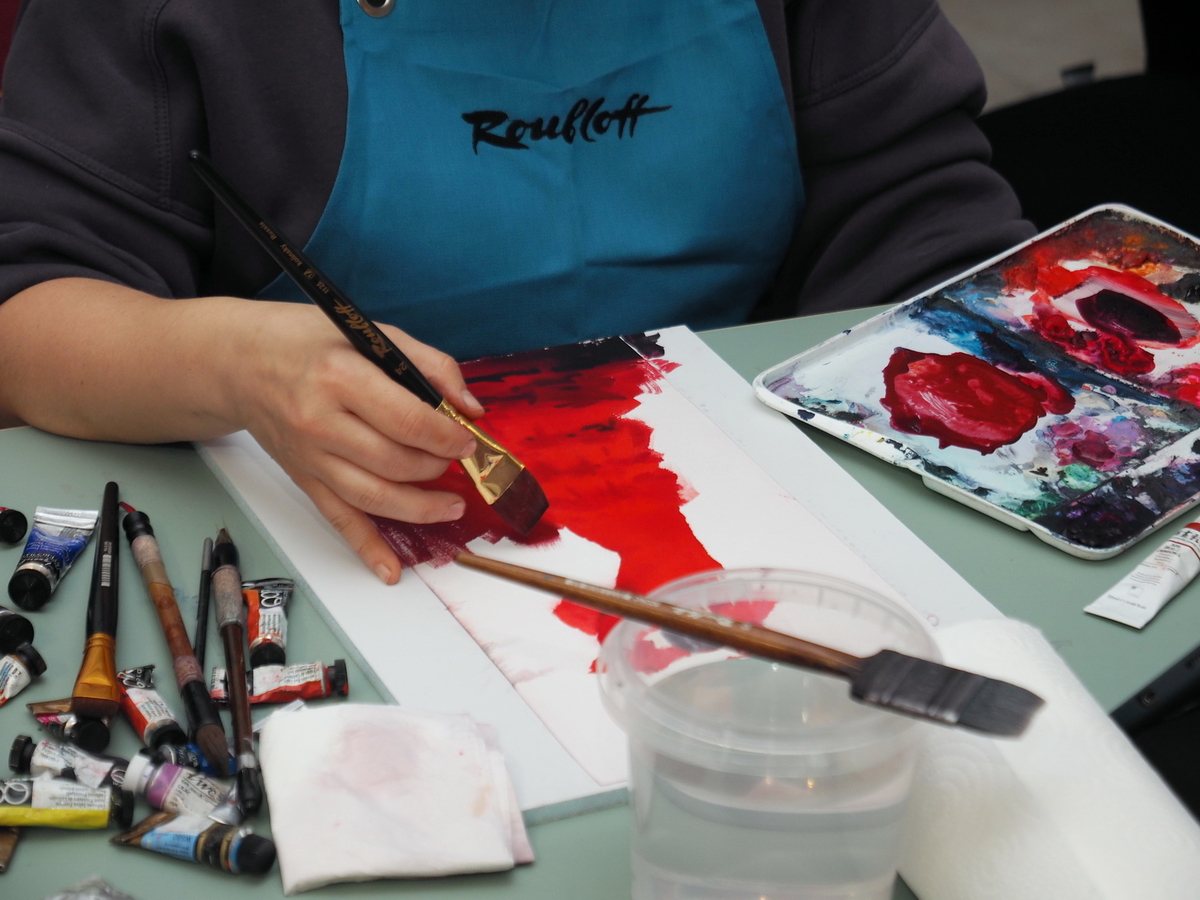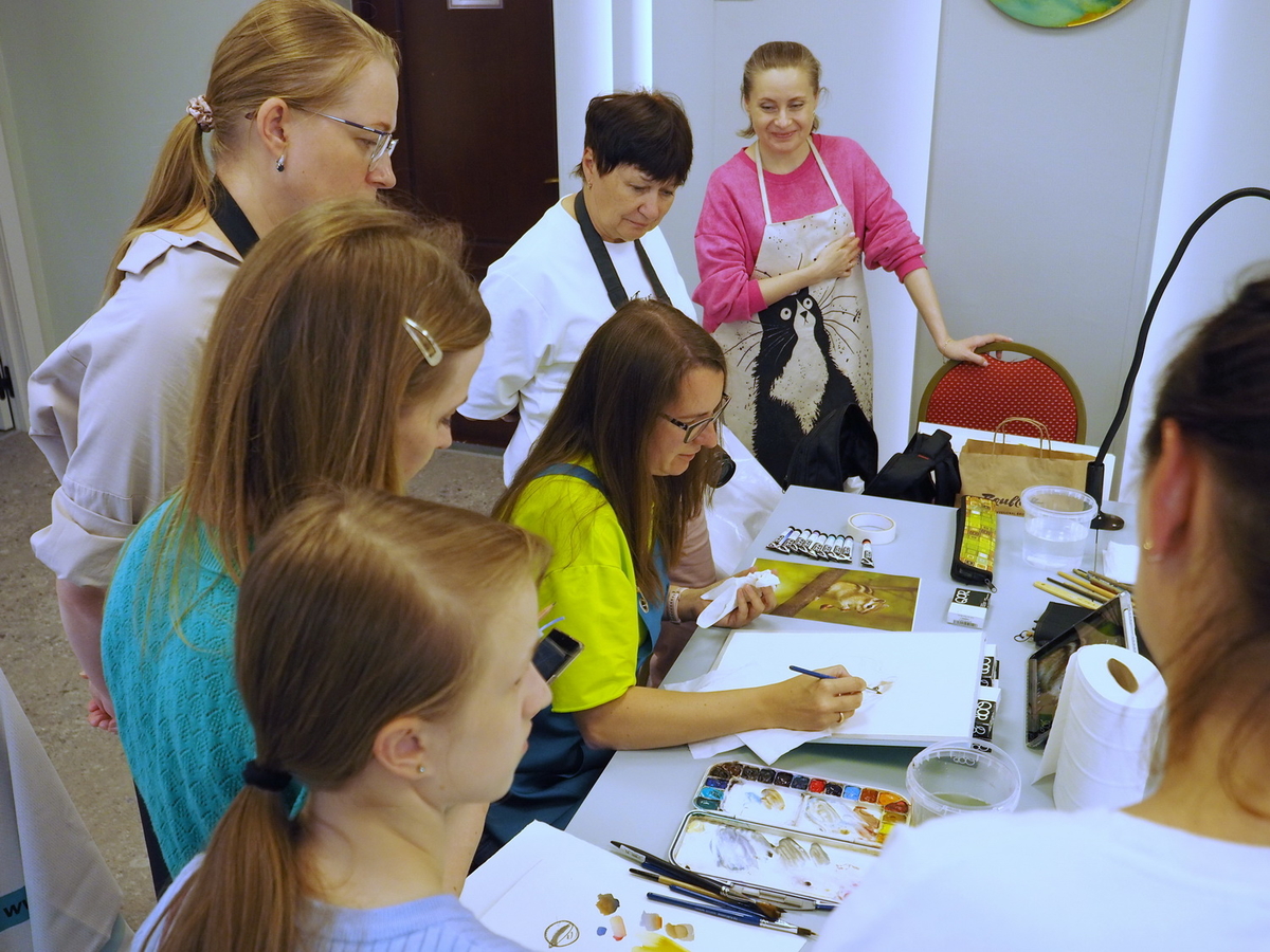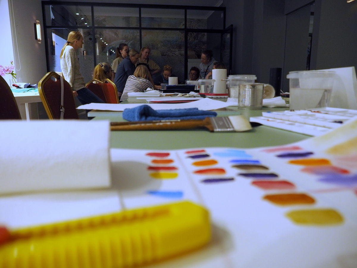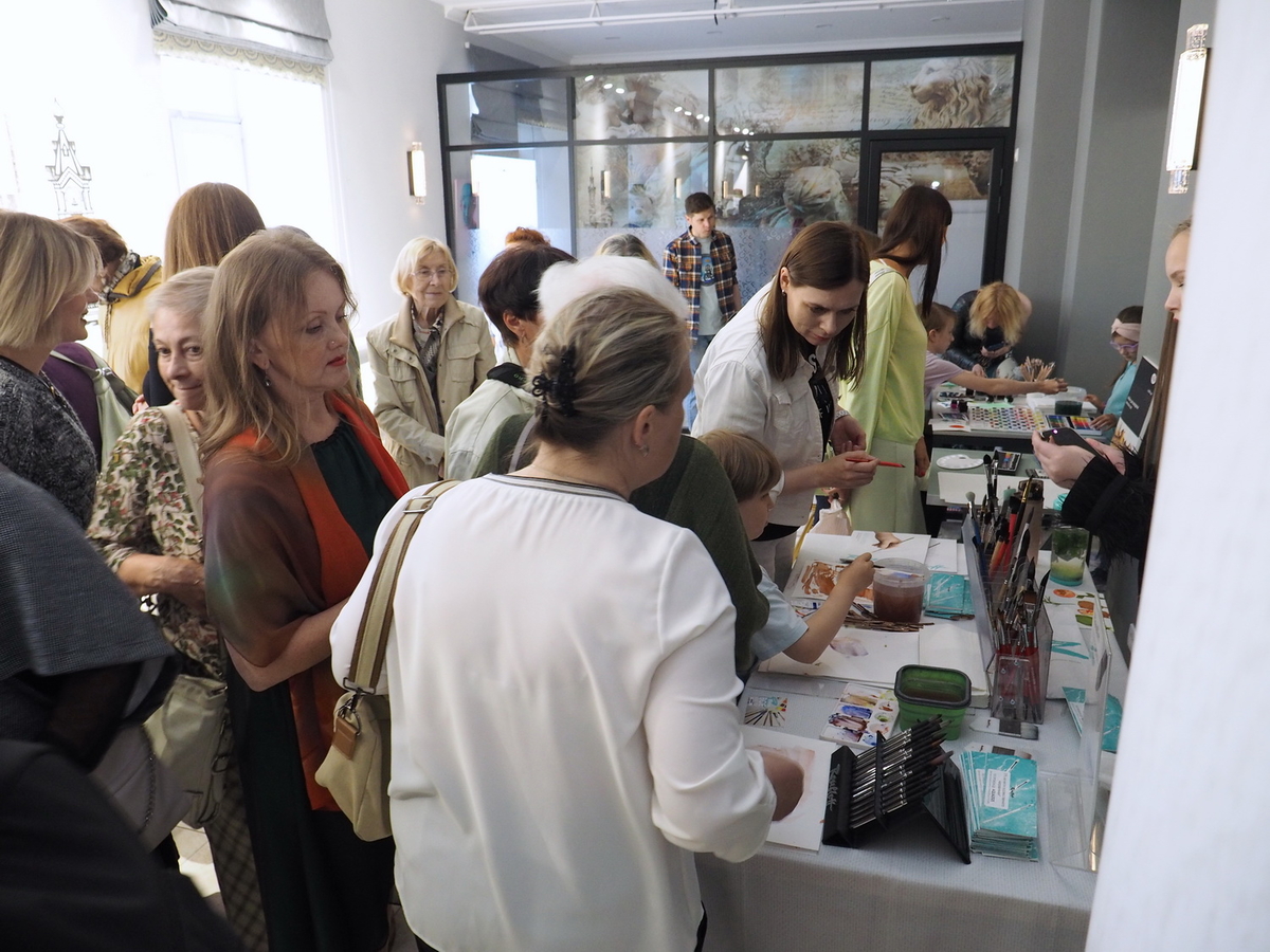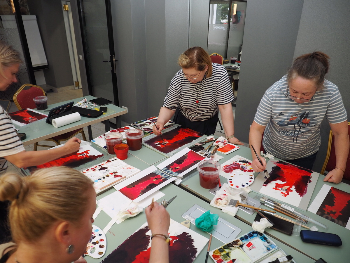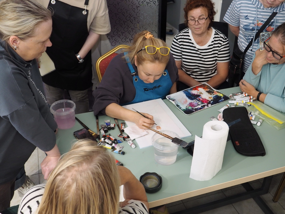 А в это время на мастер-классах царила весёлая и непринуждённая атмосфера. Участники вдохновлённо работали над своими картинам. Одна из них призналась: «Я ещё никогда в жизни не использовала столько красок!» — в контексте, что всегда рисовала и продумывала, как сэкономить, а тут же «всё включено»: бери и пользуйся материалами, сколько нужно, для сотворения своего шедевра.