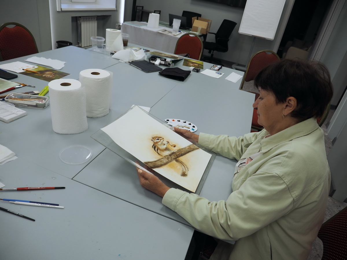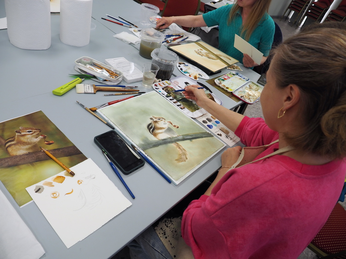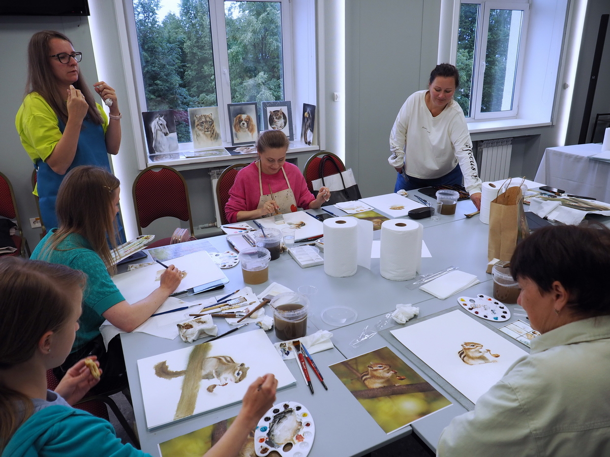 Наталья: Если говорить не о пленэристах, а о студийных мастерах, то здесь и сейчас они полностью работают на кистях Roubloff. Они передают весь свой накопленный мастерский опыт людям, которые тоже не портретисты, совсем не анималисты. Но благодаря такому волшебному инструментарию они могут абсолютно всё, что делают у себя в мастерской, проделать здесь, потому что условия позволяют. Ну, и опять же спонсоры… Люди могли с собой ничего не привозить, потому что здесь получили полностью все инструменты и материалы: бумагу, краски, карандаши, вплоть до планшетов и банок для воды, всю мелочь…