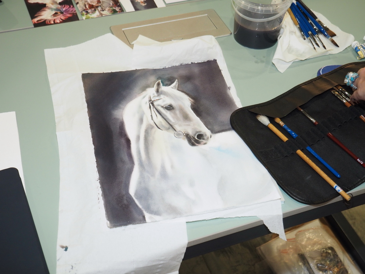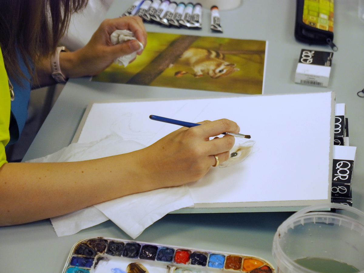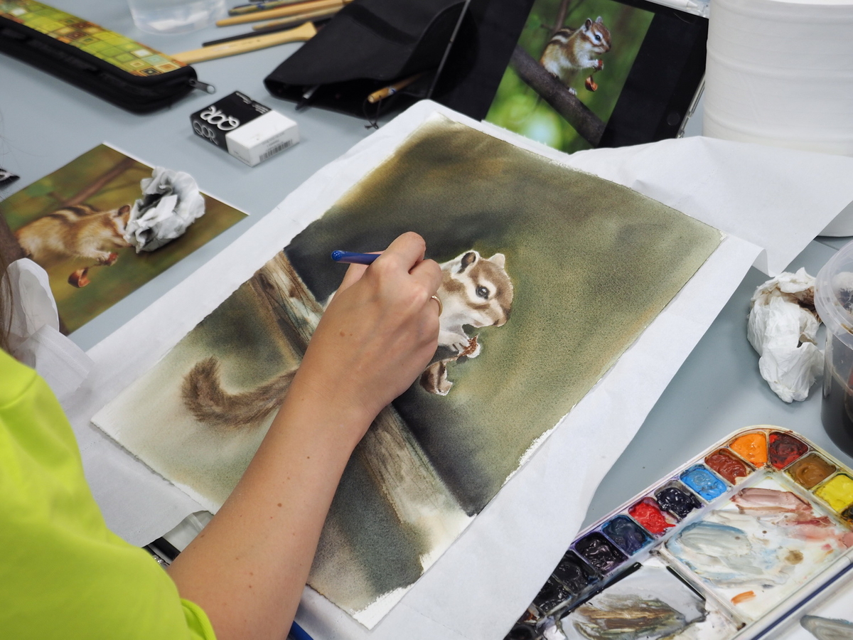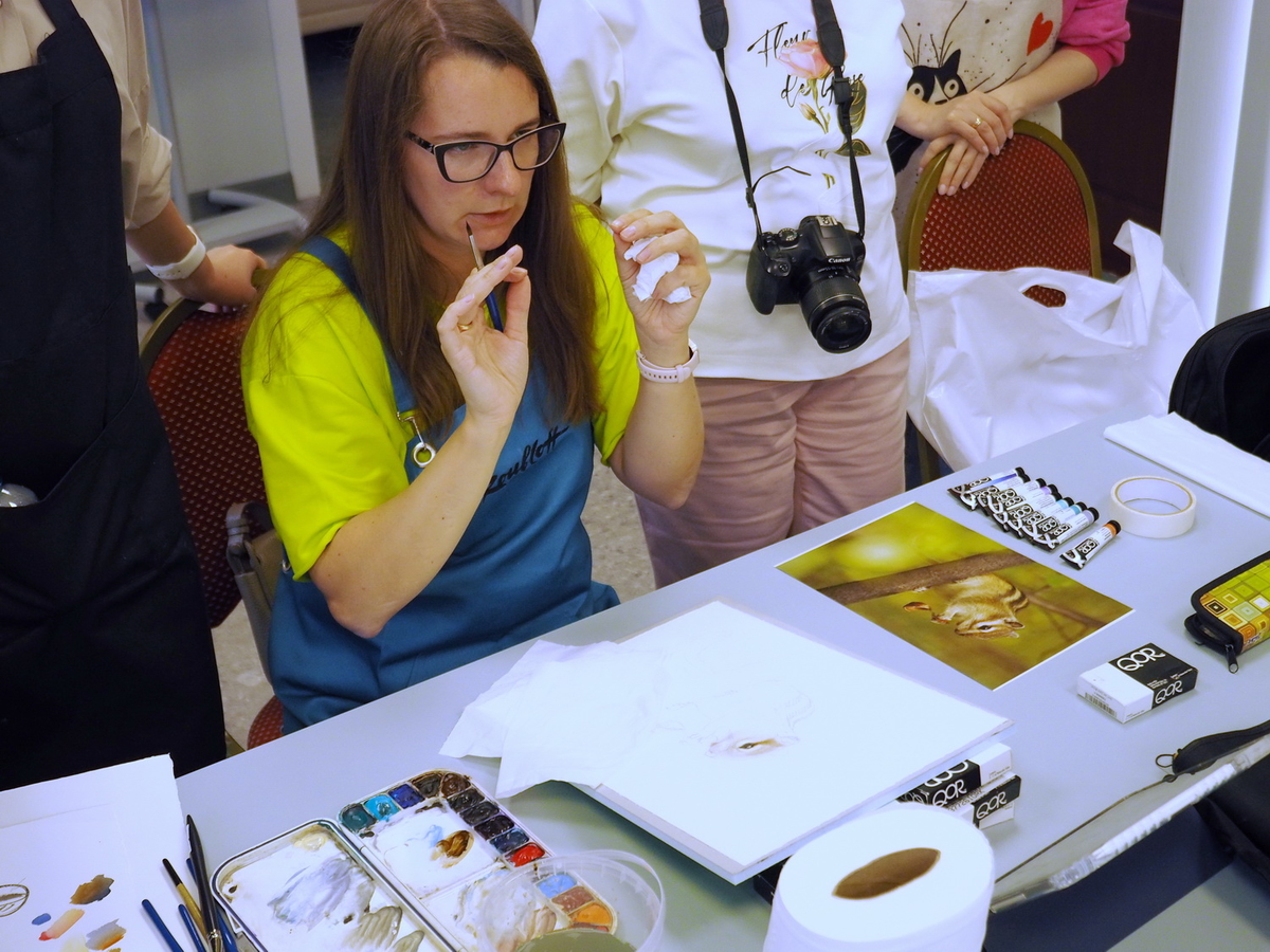 Наталья: Если говорить не о пленэристах, а о студийных мастерах, то здесь и сейчас они полностью работают на кистях Roubloff. Они передают весь свой накопленный мастерский опыт людям, которые тоже не портретисты, совсем не анималисты. Но благодаря такому волшебному инструментарию они могут абсолютно всё, что делают у себя в мастерской, проделать здесь, потому что условия позволяют. Ну, и опять же спонсоры… Люди могли с собой ничего не привозить, потому что здесь получили полностью все инструменты и материалы: бумагу, краски, карандаши, вплоть до планшетов и банок для воды, всю мелочь…