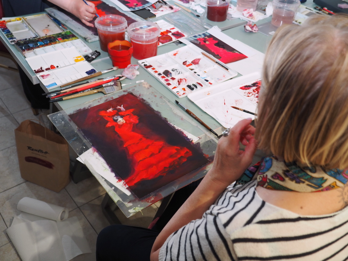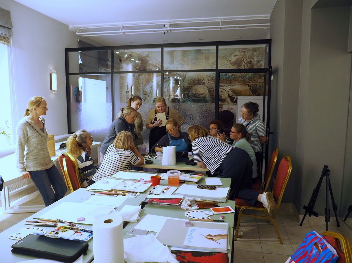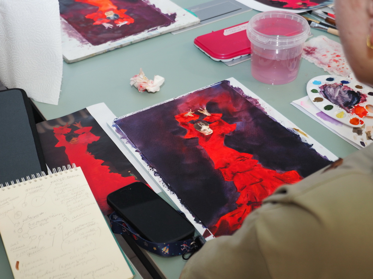 Наталья: Когда я участвую в таких мастер-классах, тоже всё время учусь. Вообще я считаю, что последний этап для художника — это когда он говорит: «Мне учиться нечему», — это значит, начнётся немедленный откат. И вот это переобучение, когда ты каждый раз приходишь к новому мастеру, провариваешься в его кухне, то выходишь новым и несёшь это в свою работу. А здесь за пять дней — пять новых техник. То есть ты должен взять все технологии, все инструменты, прожить это, осознать. А ещё у участников будет свободный день, когда они должны будут написать что-то своё, включая уже весь объём полученных знаний. Получается очень мощная огранка умений!