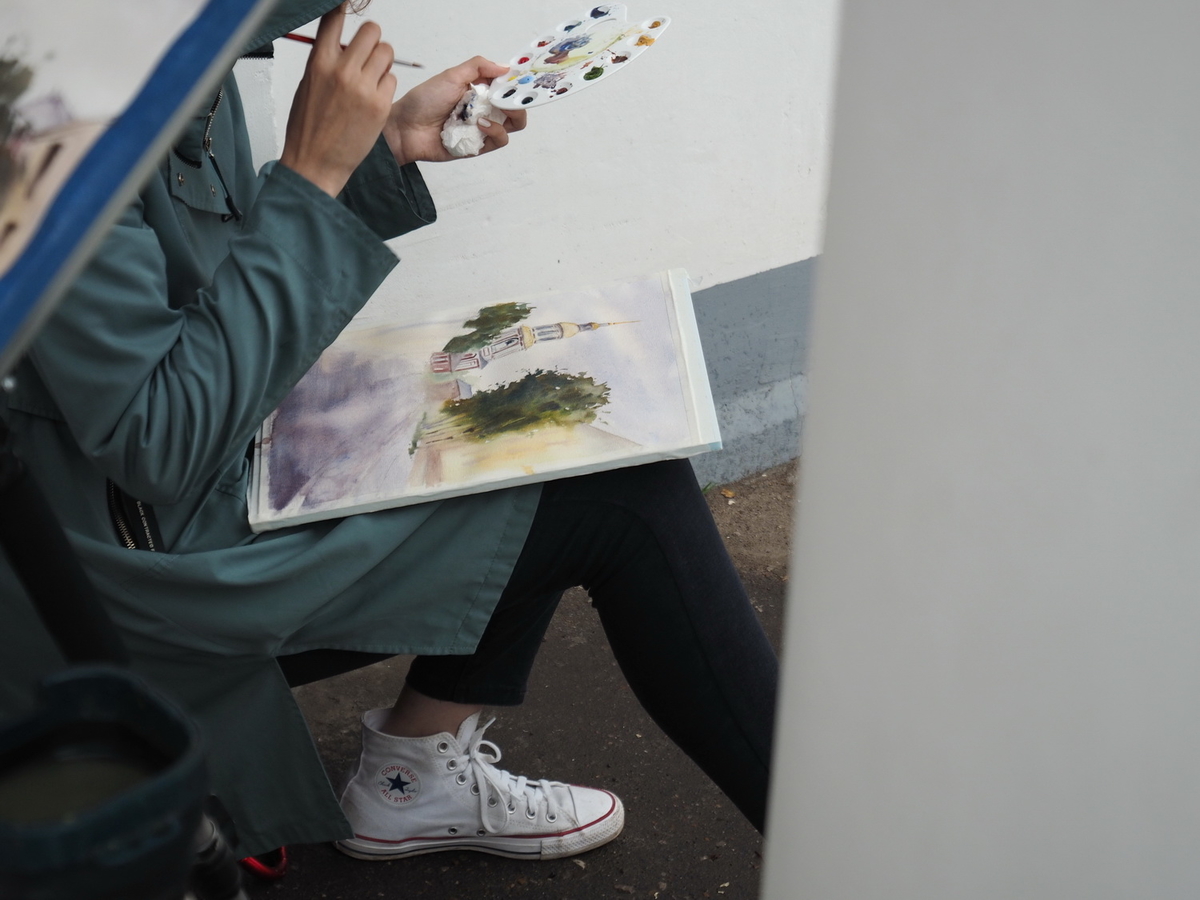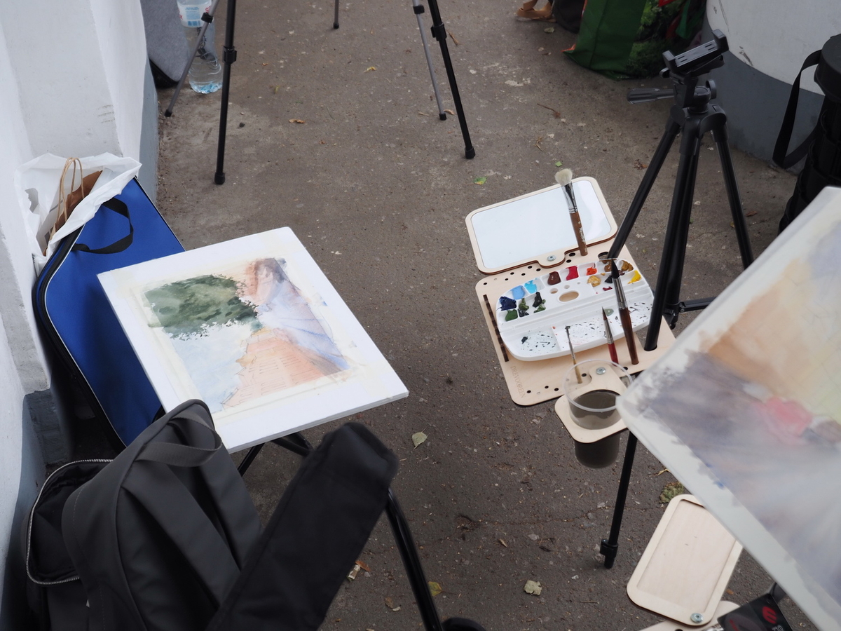 Я в свою очередь курсировал между мастер-классами и пленэрами, снимал прогресс в работах художников и участников. В какой-то момент начал моросить дождь, делая цвета окружающей обстановки гуще, ярче, чище. В то же время я наблюдал, как начинают синеть губы и дрожать руки участников пленэров. Благо, небо держало в себе влагу до последнего и обрушилось за час-полтора до окончания пленэров. Художники как могли помогали справиться с непогодой, можно сказать, что участники прошли крещение водой и холодом, но выстояли и закончили свои городские пейзажи. Думаю, если они после такого решатся на пленэры, то уже не разлюбят их никогда…
