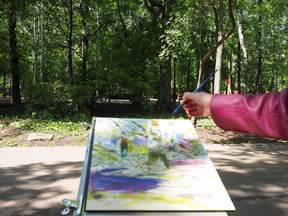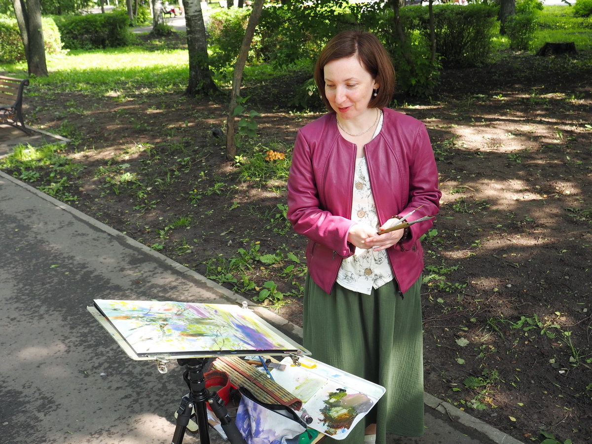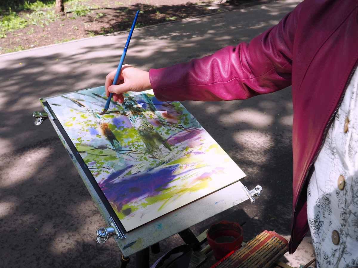 «На пленэрах я не рисую то, что вижу прямо перед собой. Для меня написание картины — передача эмоций, впечатлений... Вот сейчас увидела я как-то по особенному освещённый кусочек на дереве, он был очень красивый. И всё, я стараюсь его выделить, схватить, сделать контраст между дальним планом и вот этой большой подчёркивающей тенью. Всё остальное — это просто поддержка сюжета. При этом каждый этап написания картины может быть завершающим… Мне нравится, когда на пленэре пишется сразу творческая работа, вносится дизайн, то есть здесь мы рисуем не просто дерево… Хочется от пленэров чего-то другого, нового».