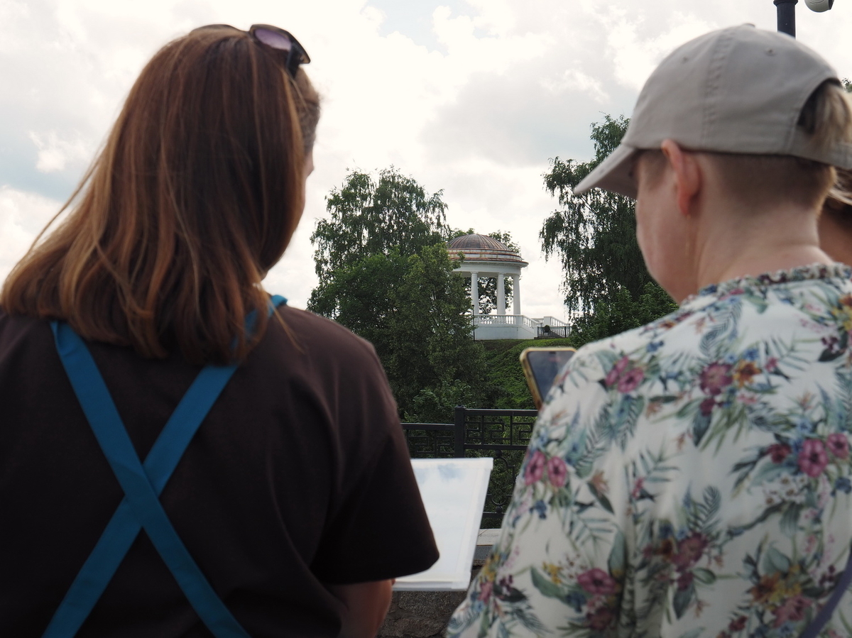 В то время, как группа Жанны Губиной скрывалась в тени древних стен, Софья Романова со своей — отправилась на кировские просторы, на набережную Грина, чтобы оттуда зарисовать Береговую ротонду, утопающую в зелени. Там открывались шикарные виды на безбрежное небо и на реку Вятку. Пиши не хочу.