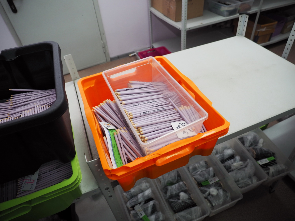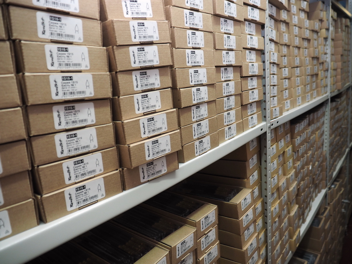 Ну и последний пункт нашей экскурсии — склад готовой продукции. Со слов Андрея Леонидовича, компания Roubloff обещает отправить поступивший заказ в полном объёме в течение трёх дней. А чтобы это не было проблемой, существует склад. Одних только художественных кистей Roubloff выпускает 960 артикулов! А ещё дополнительные артикулы для стоматологии, макияжа, нейл-дизайна, моделинга, иконописи — и всё есть на складе и готово к отправке.