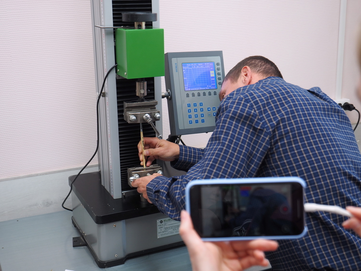 Бежим дальше. Теперь — комната с разрывной машиной, на ней тестируют качество крепления мазка к обойме, а обоймы к ручке кисти. Протестировали. Что сказать: согласно таблице отраслевых стандартов качество крепления кистей «Рублёфф» превышает указанные параметры как минимум в пять раз.