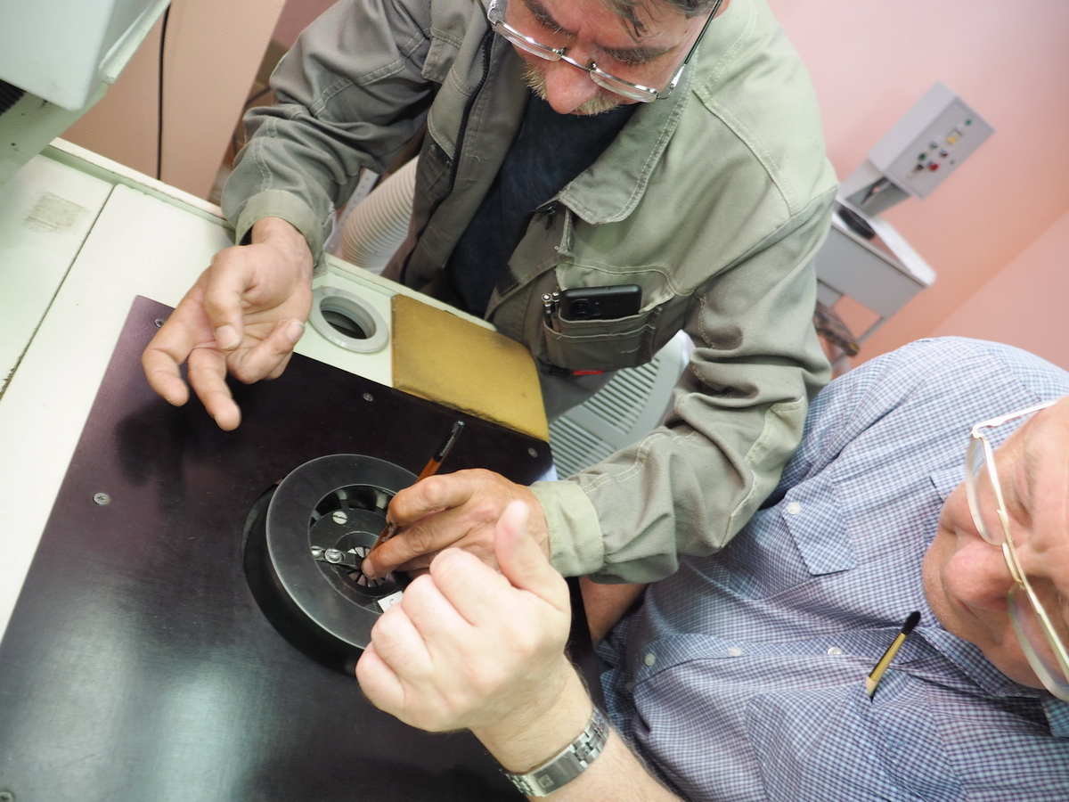 Друг за другом участники усаживались за станки. У всех по две кисти, для каждой свой станок. Каждый кисть вставляет, нажимает на педаль, губки станка обстукивают обойму кисти с ручкой по радиусу, оставляя глубокие борозды на обойме и ручке под ней, и так два раза. Кисти почти готовы.