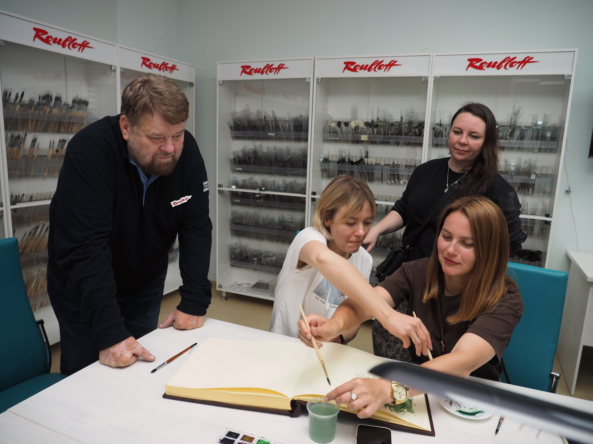 На этом наша экскурсия по производству завершилась. Но мы не закончили. Помимо участников фестиваля в составе экскурсионной группы было два художника, которые на производстве ещё не были: Жанна Губина и Софья Романова. У компании есть огромная и тяжёлая из-за листов плотной бумаги книга отзывов, в которой девушки решили оставить свои рисовальные пожелания компании Roubloff. Были быстро организованы краски, кисти Жанна и Софья ранее сами себе сделали. Настал черёд проверить их в деле!