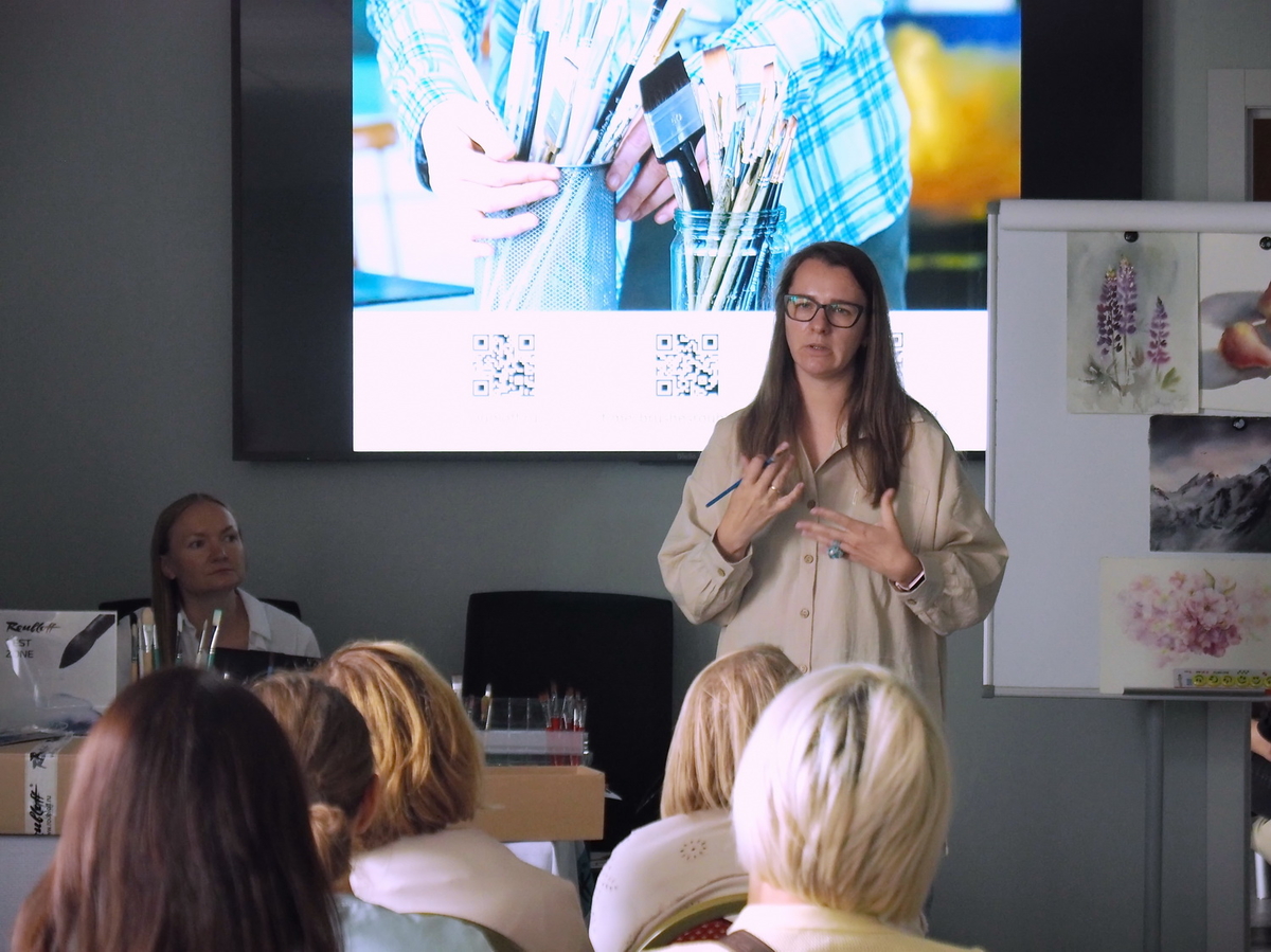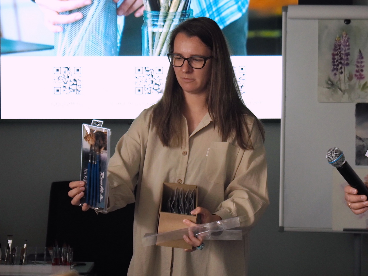 В этот день Татьяна Фролова выступала для нас, слушателей, в роли художника, эксперта художественного направления Roubloff и автора-разработчика нескольких коллекций художественных кистей Roubloff. Её лекция, конечно же, была посвящена компании и производимым кистям, тому, как их делают, какие они бывают, как подобрать их для себя, своей техники рисования, собрать свой набор.