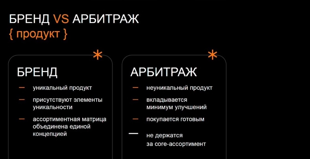В отличие от арбитража, который работает с готовым товаром и может лишь незначительно его доработать (например, изменить упаковку), бренд создаёт определённую матрицу уникальных товаров, в основе которой лежит некий core-ассортимент, ассоциирующийся у потребителя с этим товаром.
