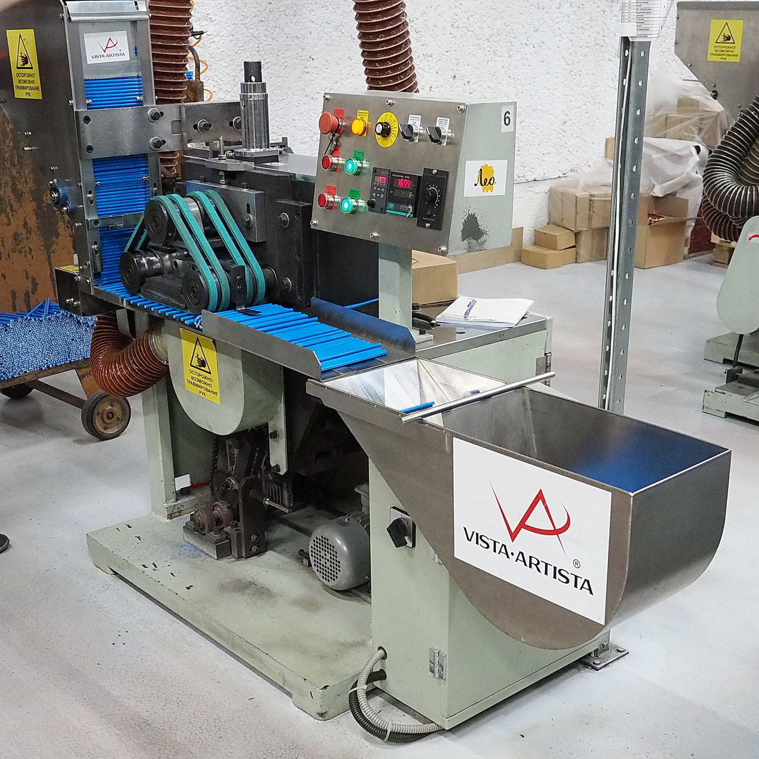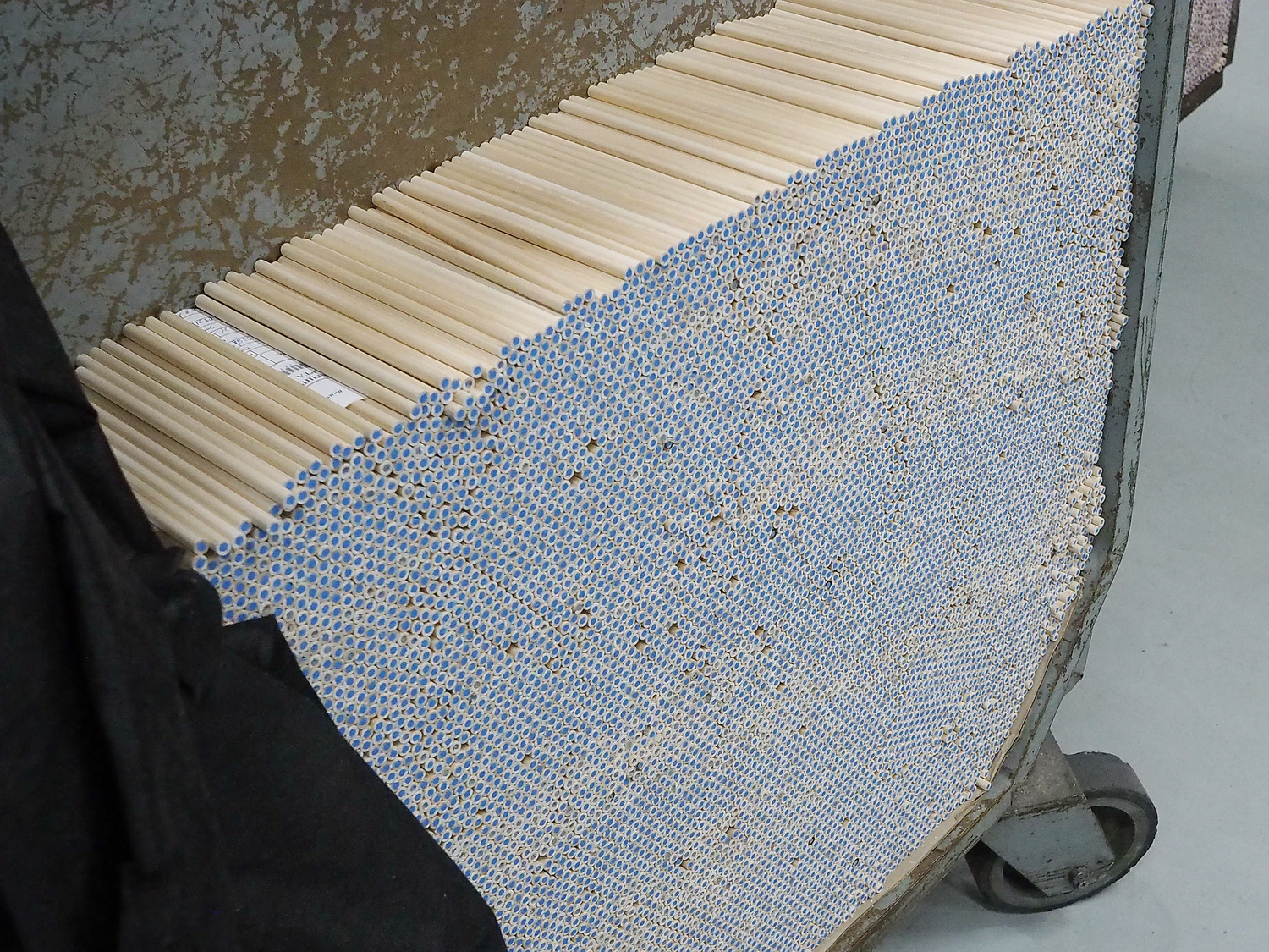 После окрашивания, пропустим момент с дип-топом, все карандаши отправляются на станок, обрезающий, подгоняющий их под одну длину. После этого карандаши укладывают в специальную тележку, чтобы перевезти к следующему этапу.
