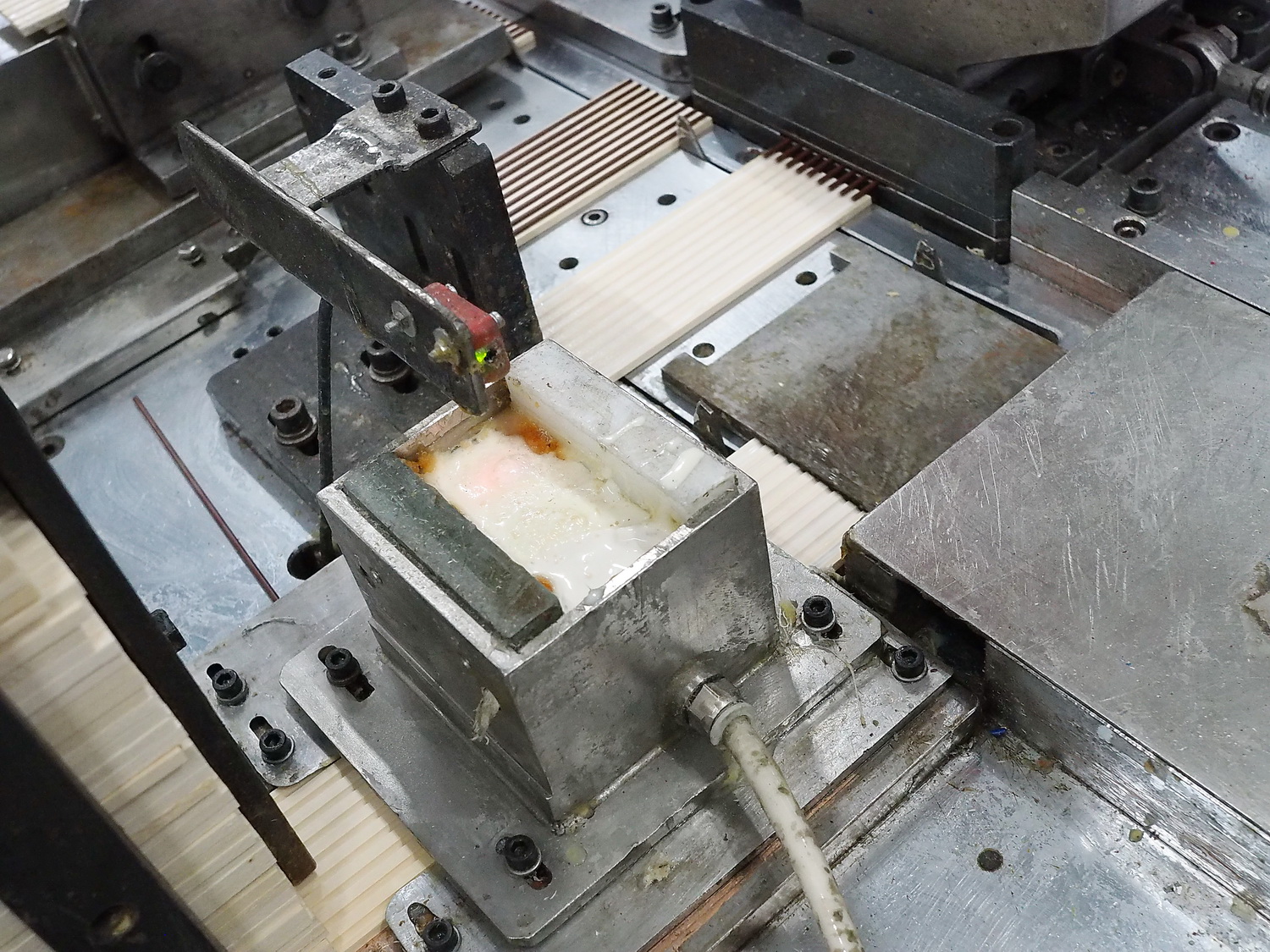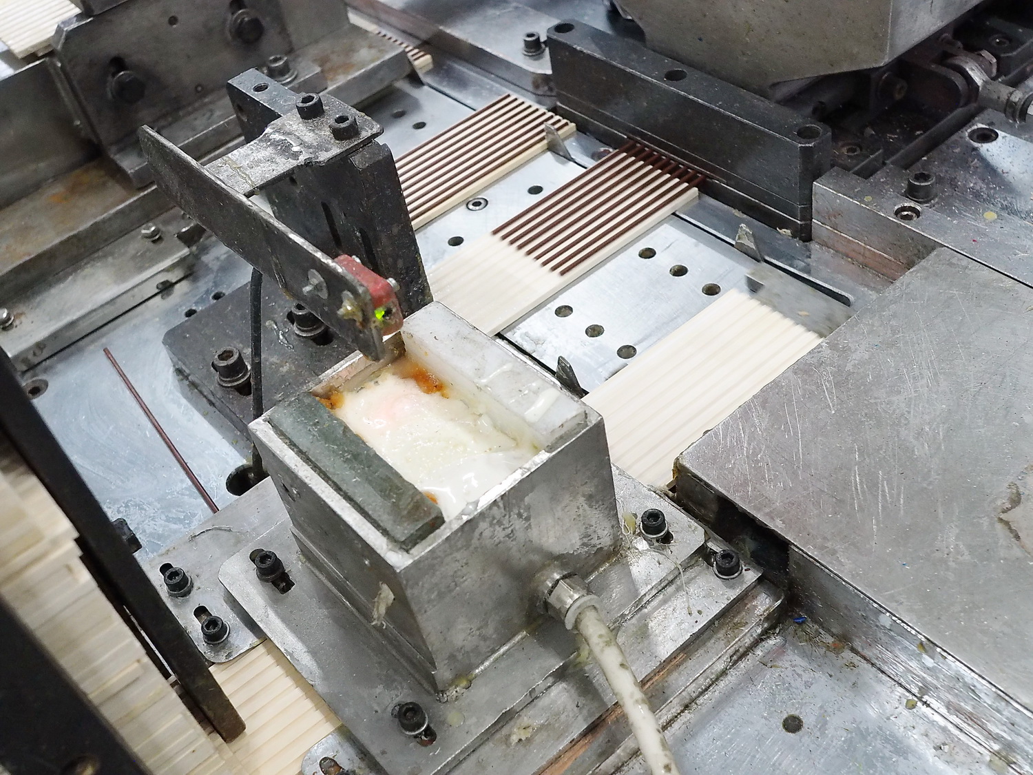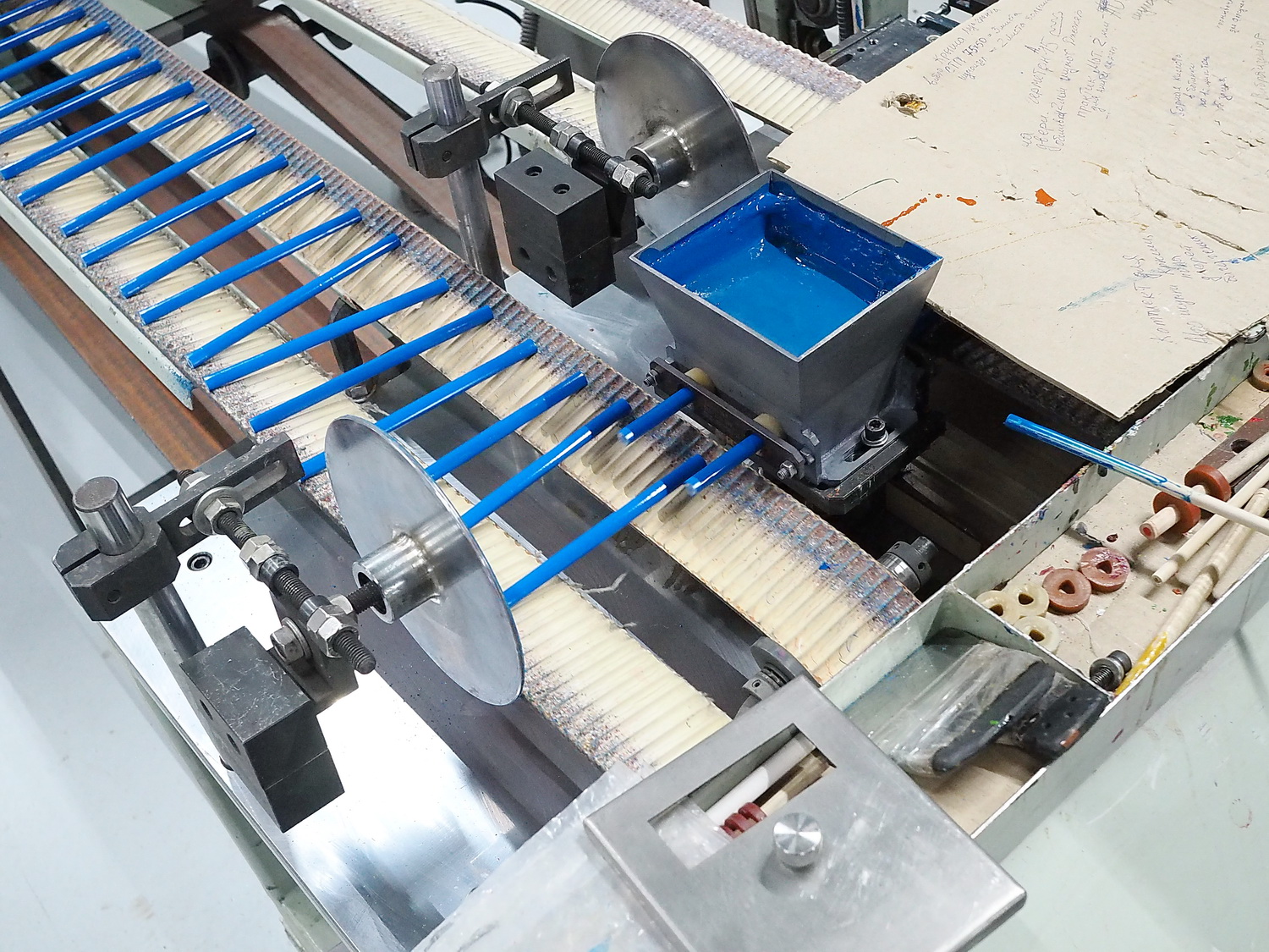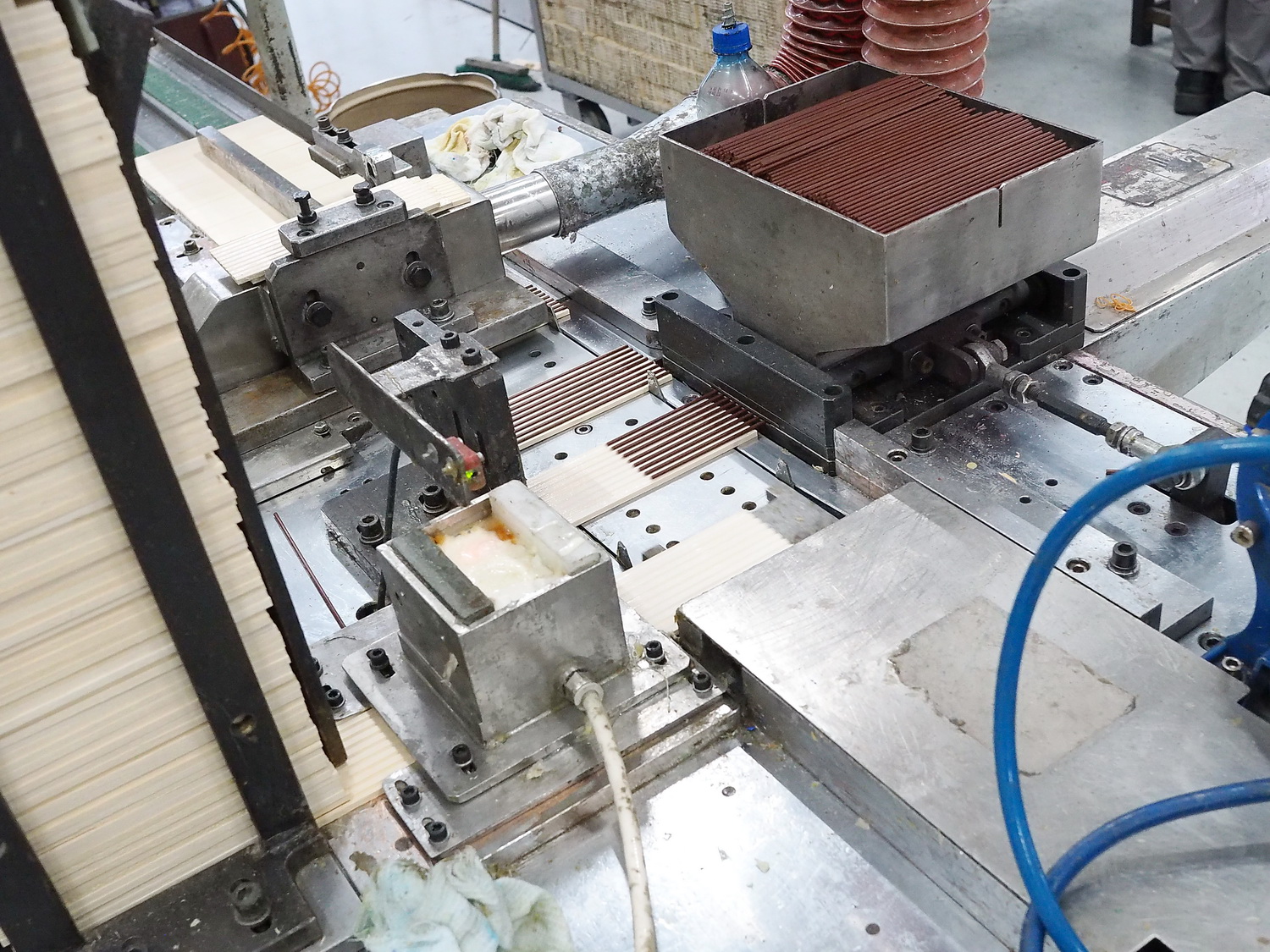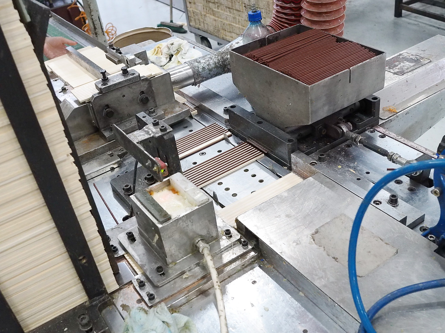 Следующий этап — укладка и вклейка грифелей в подготовленные дощечки. На дощечку наносится слой клея ПВА, поверх в канавки автоматом подаются и укладываются грифели, а затем сверху накладывается вторая дощечка. Получается карандашный блок, эдакий деревянный бутерброд с начинкой из грифелей посередине.