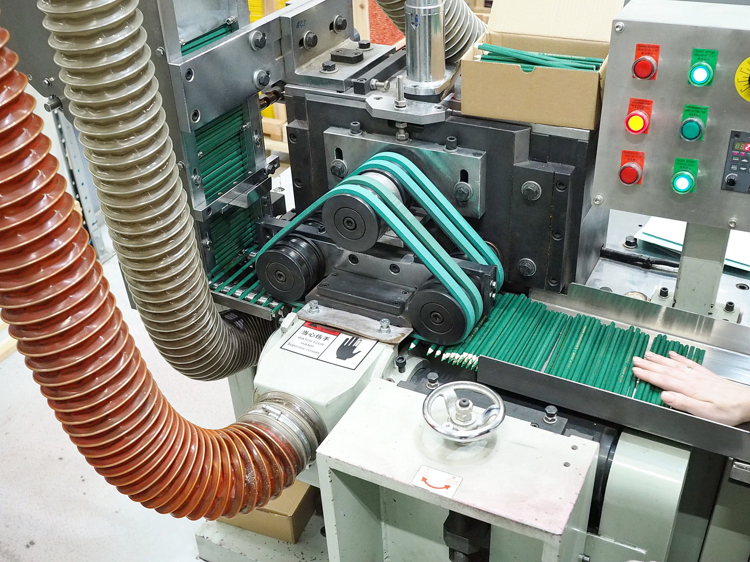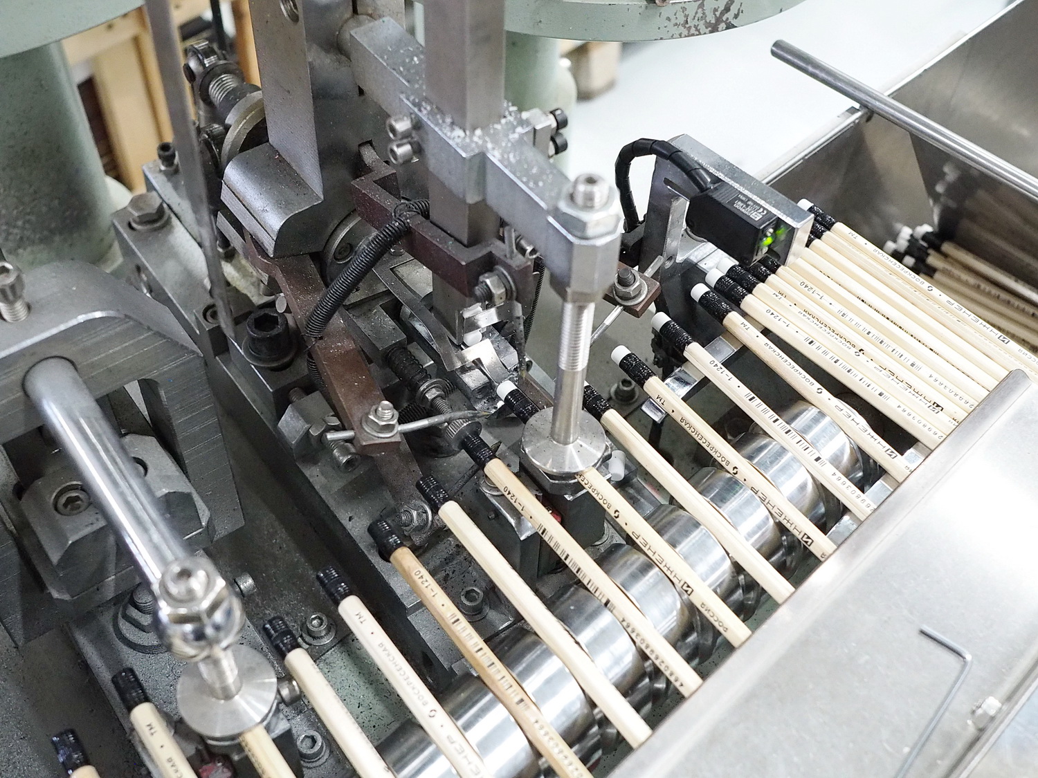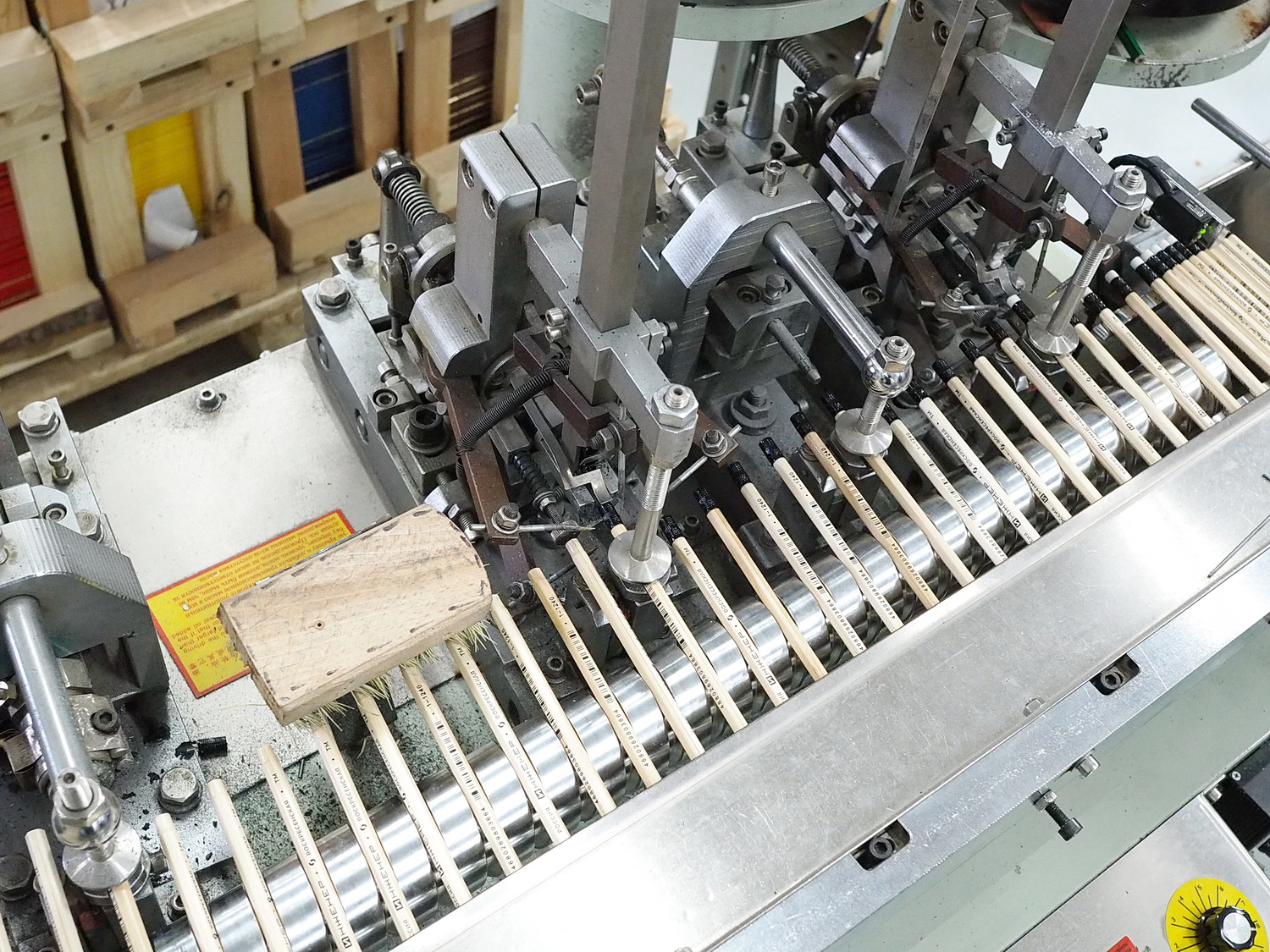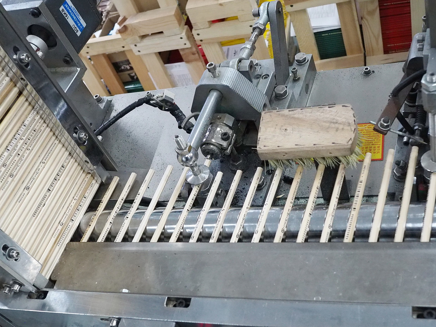 Этот этап, как и последующий, опциональный, то есть если он запланирован при производстве. Сейчас почти все карандаши поставляются потребителю заточенные, но всегда есть исключения. В общем, после штемпелёвки карандаши отправляются на станок, их затачивающий. Происходит это с огромной скоростью с помощью шлифовального круга или барабана. Однако сам процесс скрыт под защитным кожухом, так что показать я его не смогу. Просто выглядит это так, что с одной стороны подаются незаточенные карандаши, а с другой стороны выезжают уже готовые — заточенные.