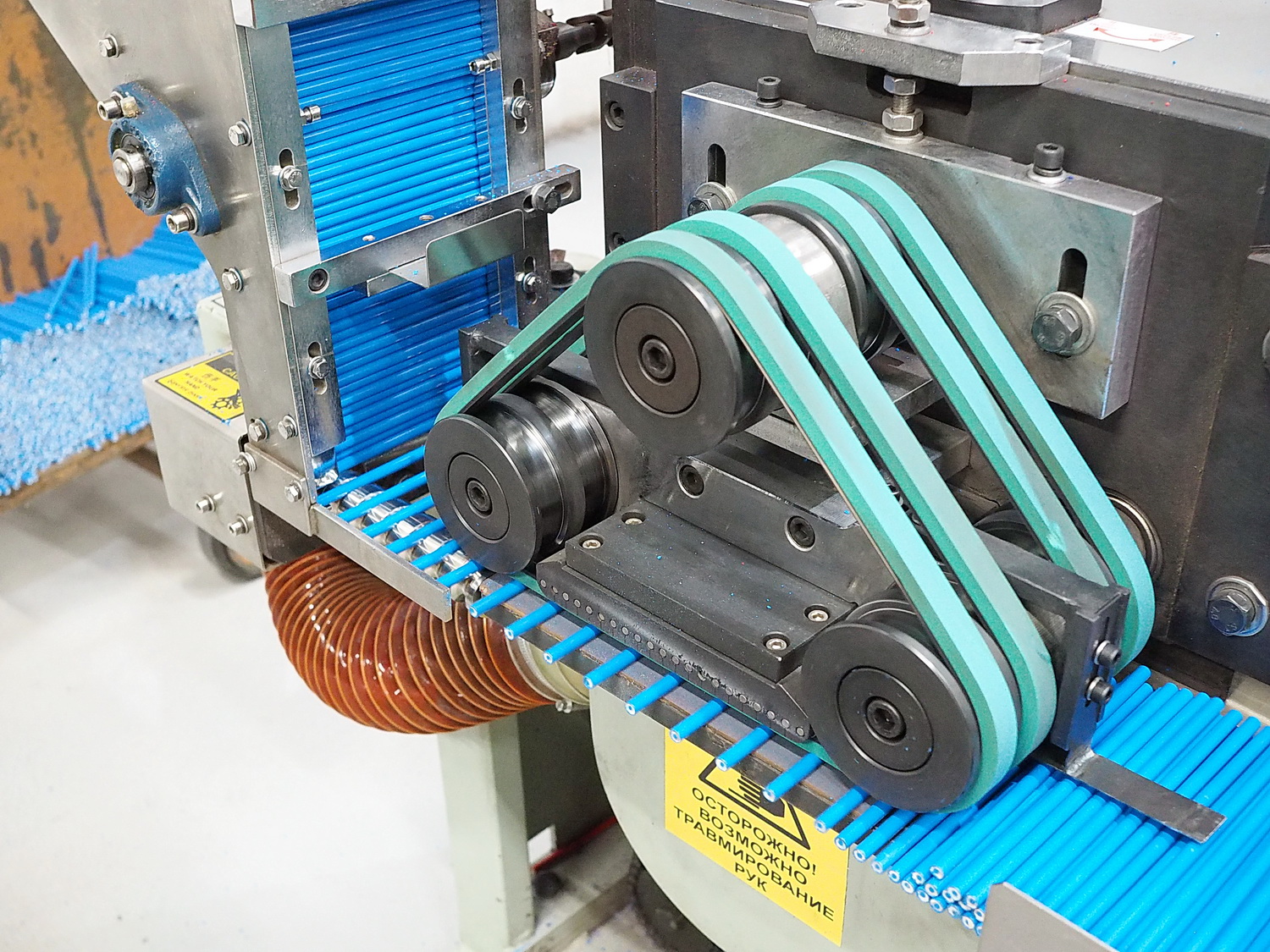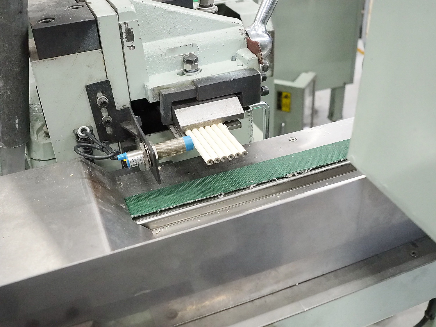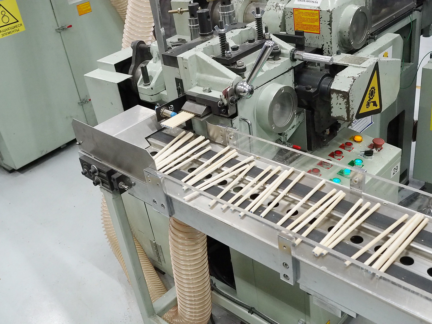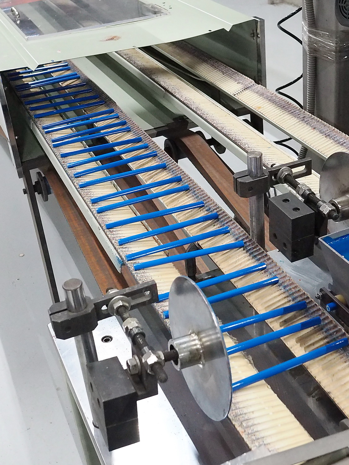 Этот этап, как и последующий, опциональный, то есть если он запланирован при производстве. Сейчас почти все карандаши поставляются потребителю заточенные, но всегда есть исключения. В общем, после штемпелёвки карандаши отправляются на станок, их затачивающий. Происходит это с огромной скоростью с помощью шлифовального круга или барабана. Однако сам процесс скрыт под защитным кожухом, так что показать я его не смогу. Просто выглядит это так, что с одной стороны подаются незаточенные карандаши, а с другой стороны выезжают уже готовые — заточенные.