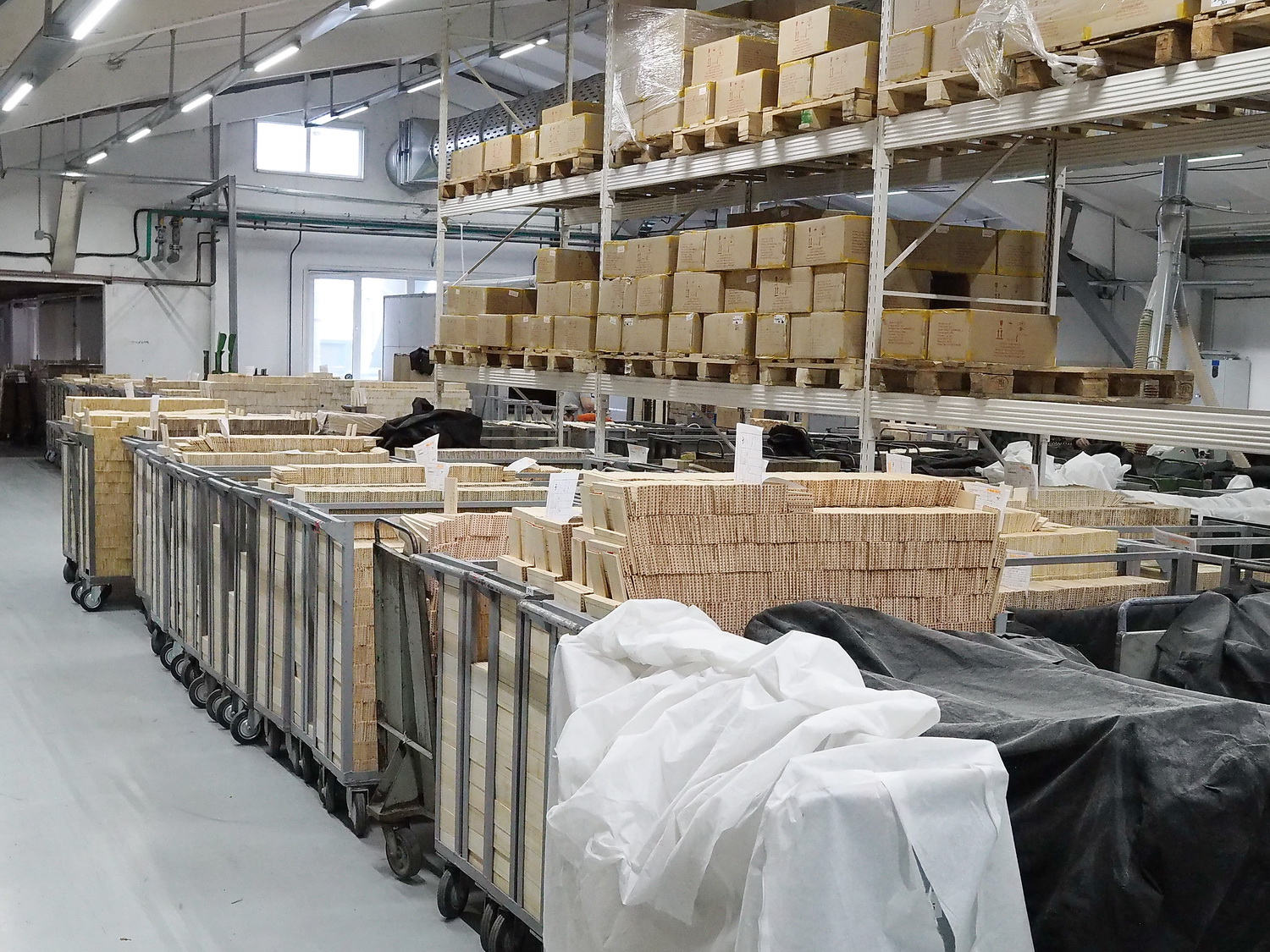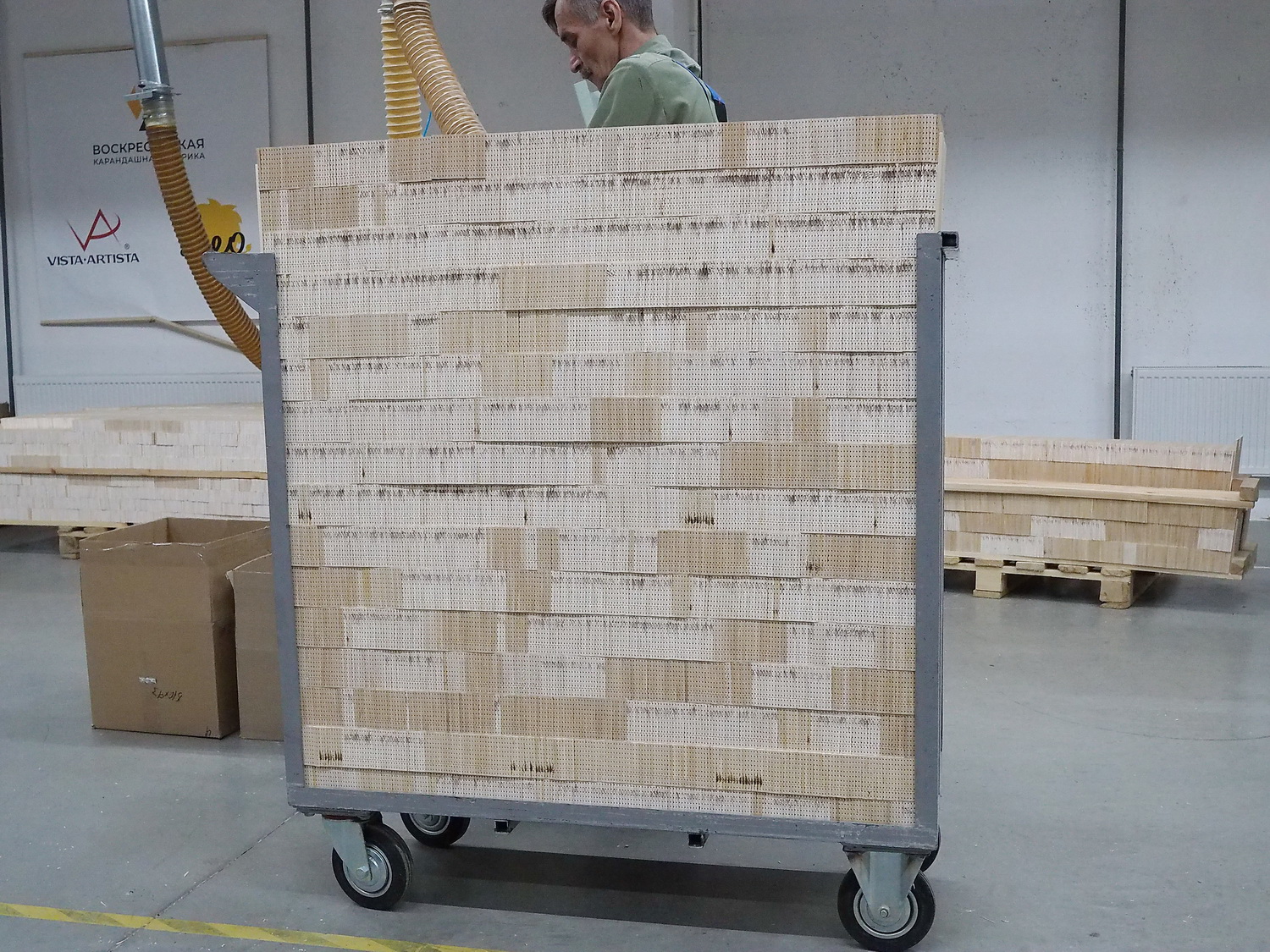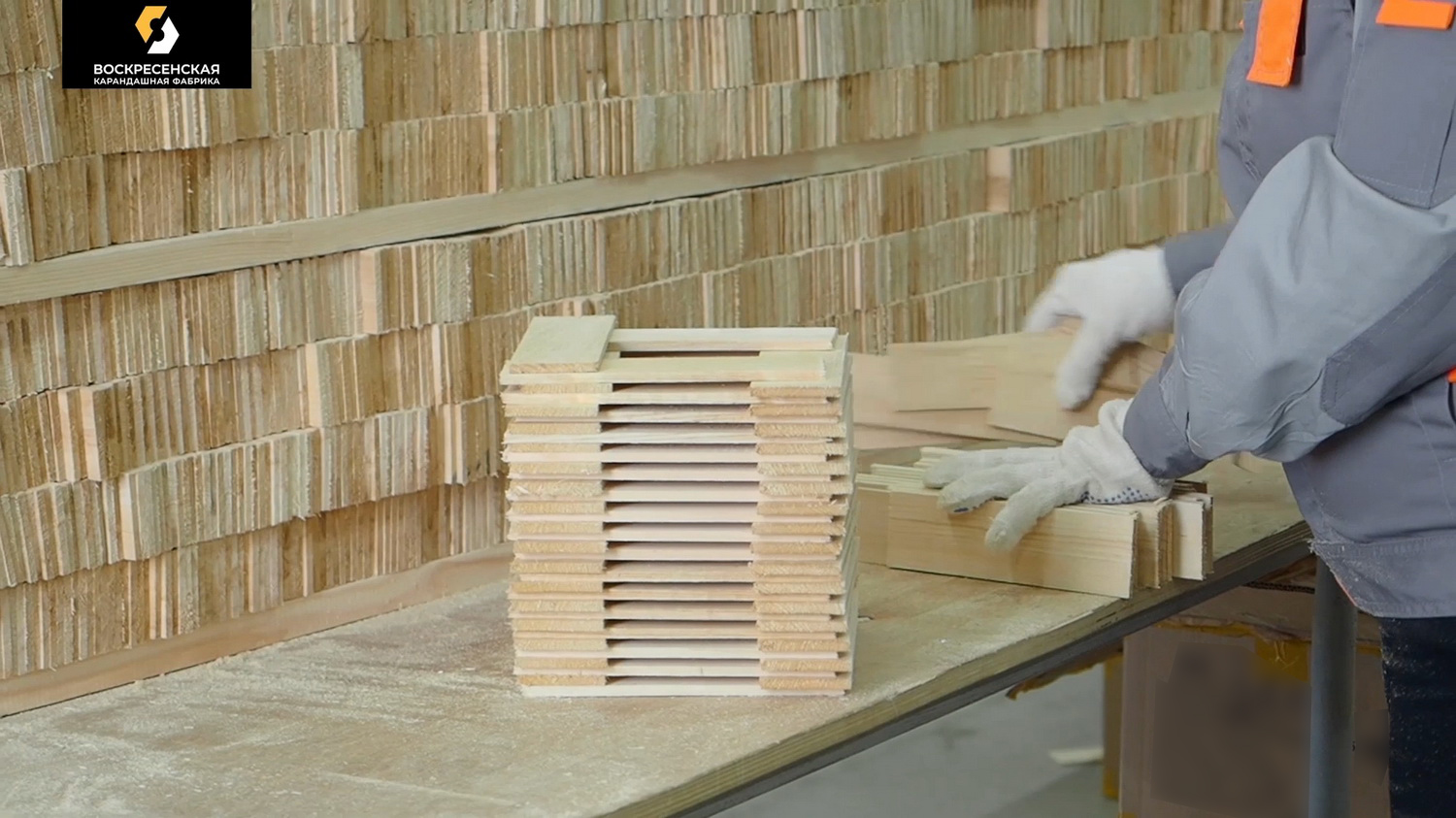 Этот самый ангар доверху наполнен паллетами с уложенными на них специальными дощечками, приготовленными к сушке для последующей обработки. Дощечкой называют особую деревянную заготовку определённой формы и размеров. В дальнейшем из неё и будут делать карандаши. Эти дощечки — из отборной липы, которую сортируют и собирают по всей стране. Так, а почему же липа?
