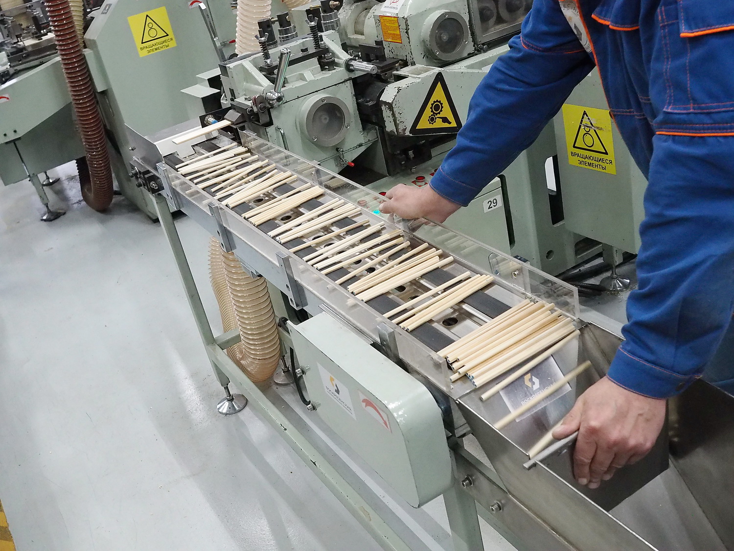 Рядом с предыдущим станком стоят столы сортировщиц. Они вручную перебирают получившиеся карандаши, сортируя хорошие годные и отделяя дефектные бракованные. Человеческие руки и глаза в этом деле самый лучший сканер — ощущают все недостатки карандашей: шероховатости на поверхности, заусенцы и задиры, сколы грифеля на торце и так далее.