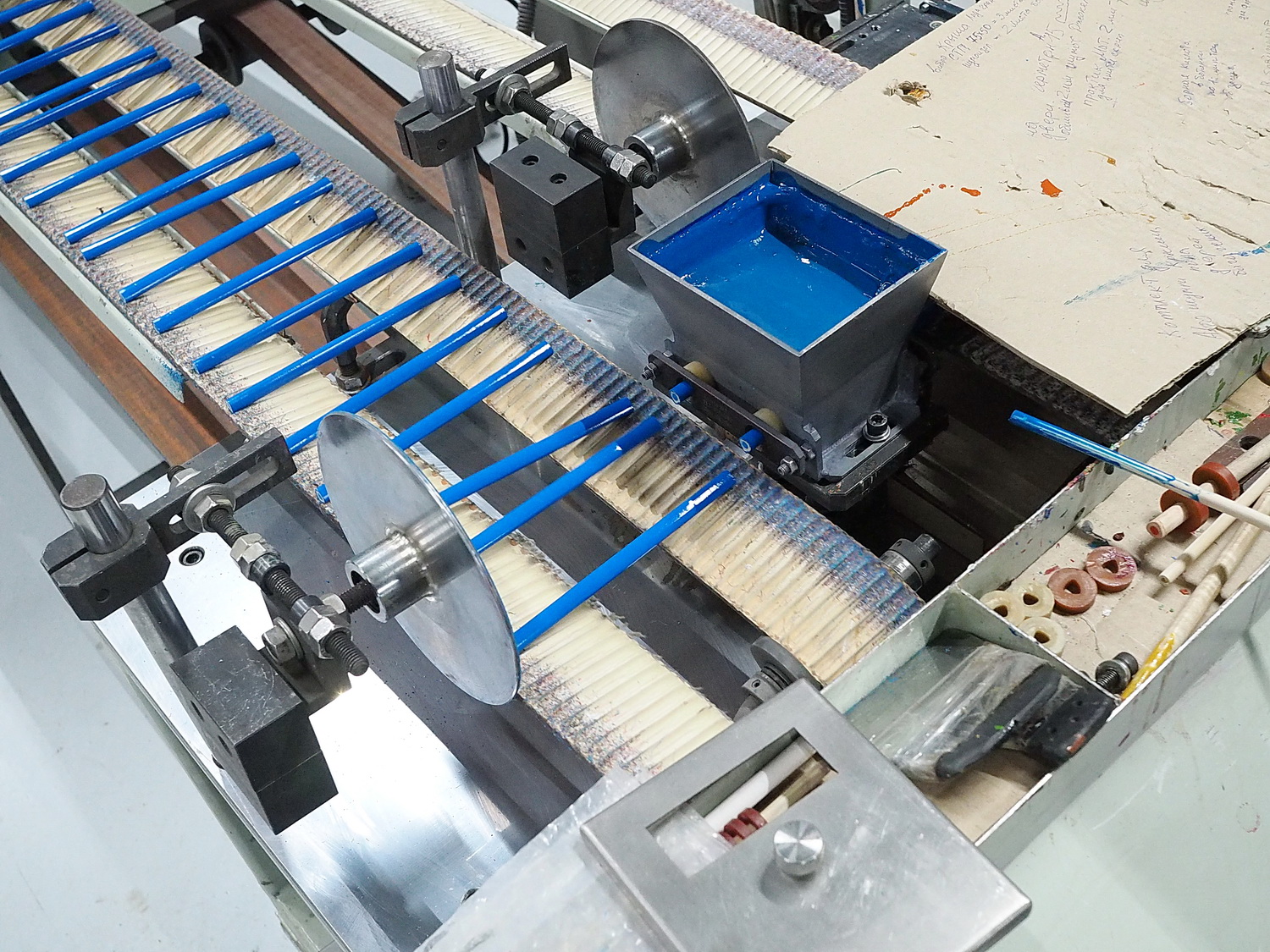 После грунтовки и просушки карандаши по конвейерной ленте отправляются дальше, на покраску. Уже грунтованные карандаши пропускают через устройство с ёмкостью с готовой краской. Такой метод протяжки карандашей сквозь краску называется экструзия. После этого уже окрашенный карандаш возвращается на конвейерную ленту, чтобы попасть на следующий этап.
