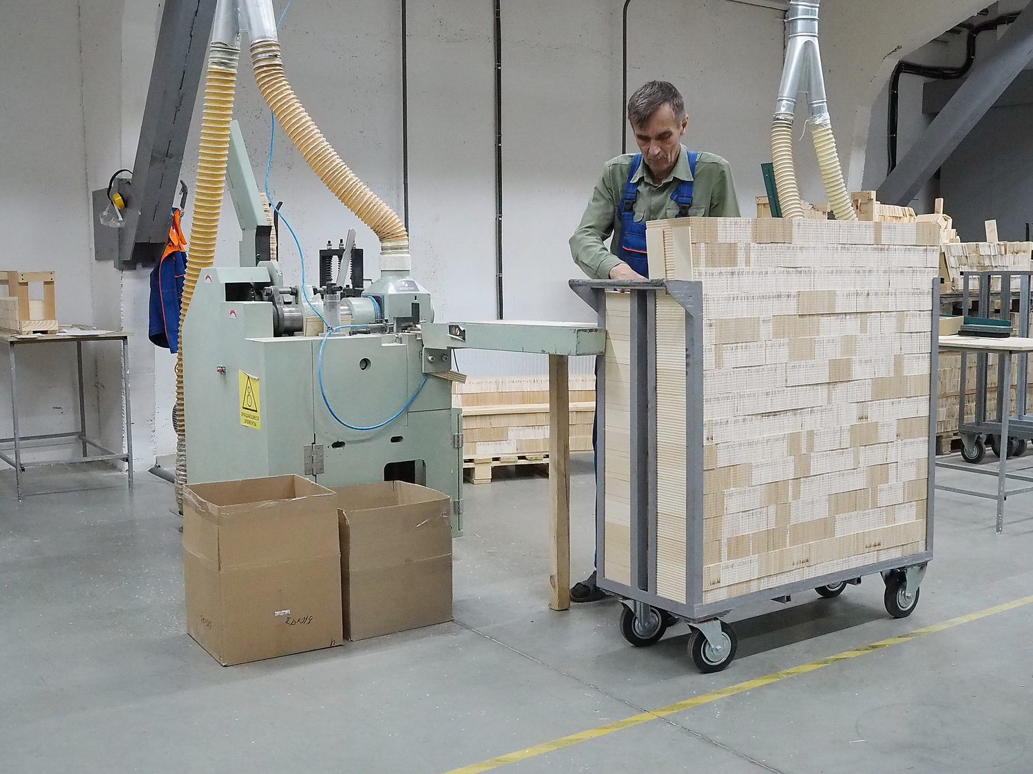 На специальном оборудовании подготовленные дощечки укладывают в так называемые колодцы и выстраивают на паллетах.