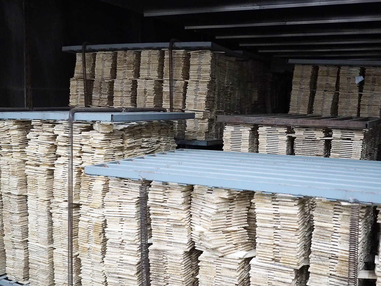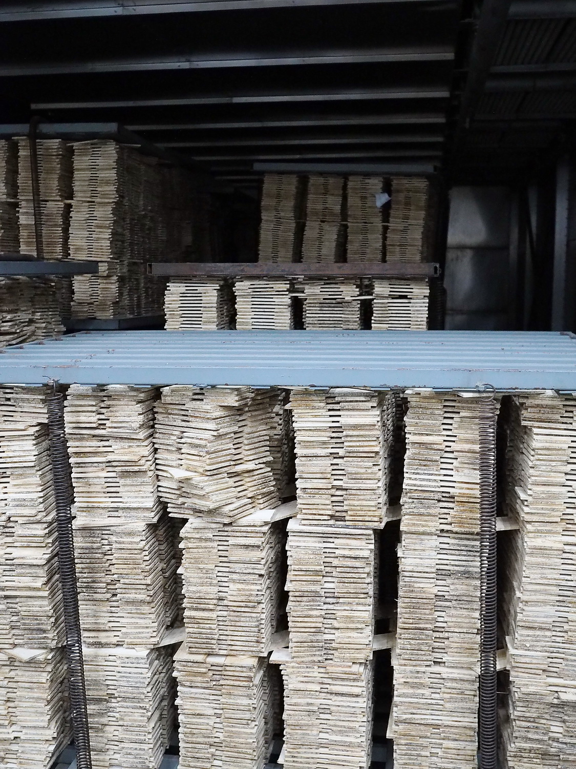 После того, как паллета полностью заполнится дощечками, их под прессом отправляют в огромный сушильный шкаф, где просушивают и доводят до необходимой степени влажности.