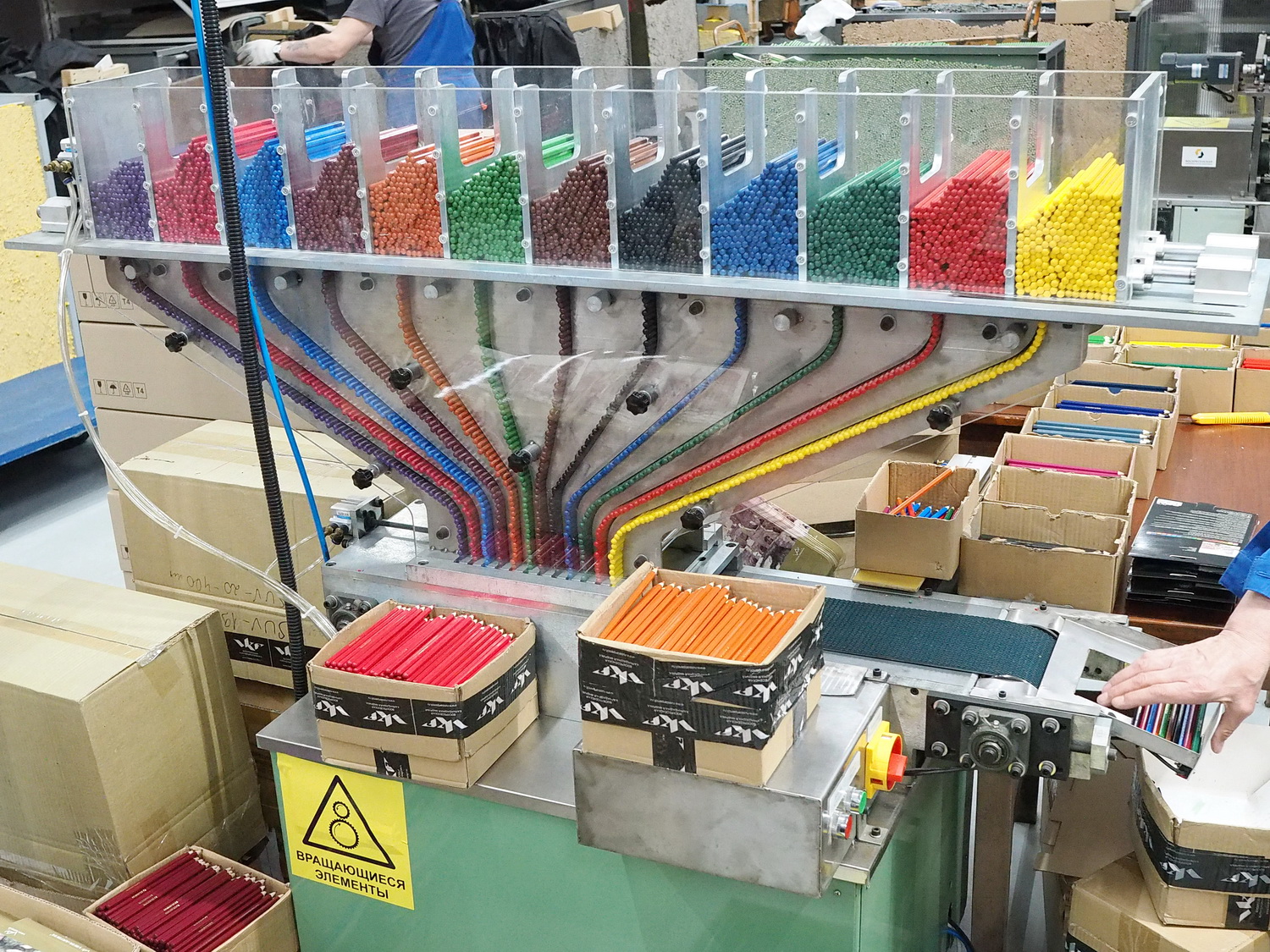 Как и отбраковка, укладка и фасовка карандашей тоже происходит вручную. Можно сказать, что это последняя линия контроля. Сотрудники фабрики собирают картонные упаковки, потом по линии к их рабочему месту подаются карандаши, готовые к фасовке. Например, если речь идёт о наборах цветных карандашей, то на ВКФ есть станки, способные подать фасовщику сразу 12 штук нужных цветов. Просто и удобно.
