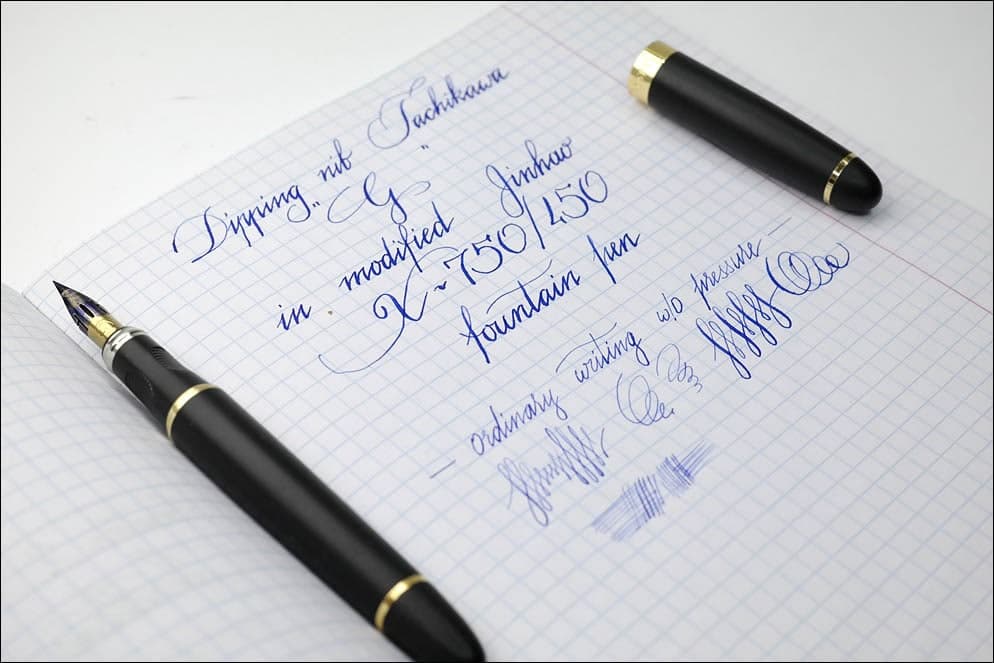 А в плане обслуживания перьев мне очень повезло с китайскими ручками. Чисто случайно. Объясню: большинство современных пользователей перьевых ручек не очень интересуется свойствами гибкости перьев и возможностями курсивного письма. Им, во-первых, важно просто гладкое письмо, во-вторых, стабильная подача чернил. Поэтому чаще всего люди обращают внимание на внешний вид ручек в сочетании с ценой.